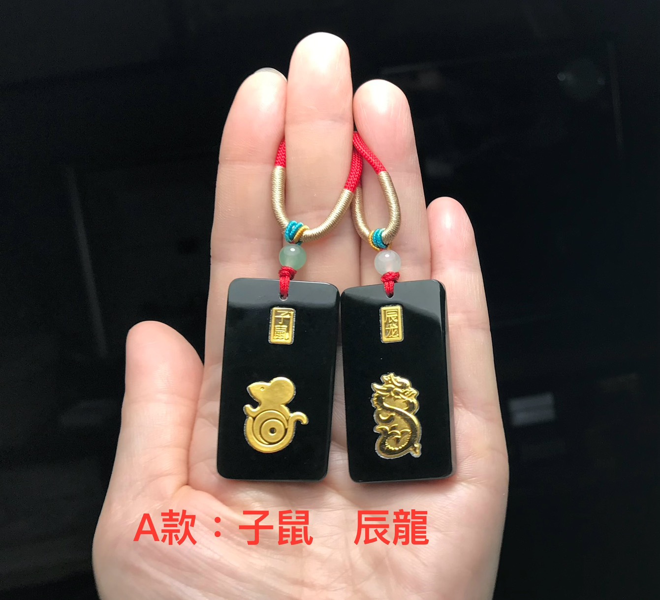 A款 純金黃金 鑲天然和田墨玉 生肖玉牌