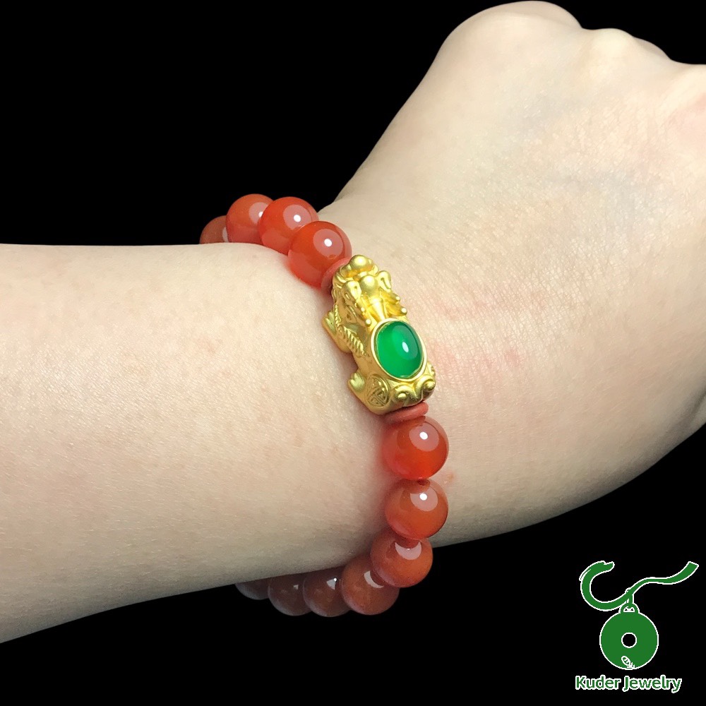[快速出貨]【Kuder Jewelry】中性款男女適用-招財納福好運來-銀鍍金貔貅紅玉髓手鍊附珠寶鑑定書送小金馬吊飾一件