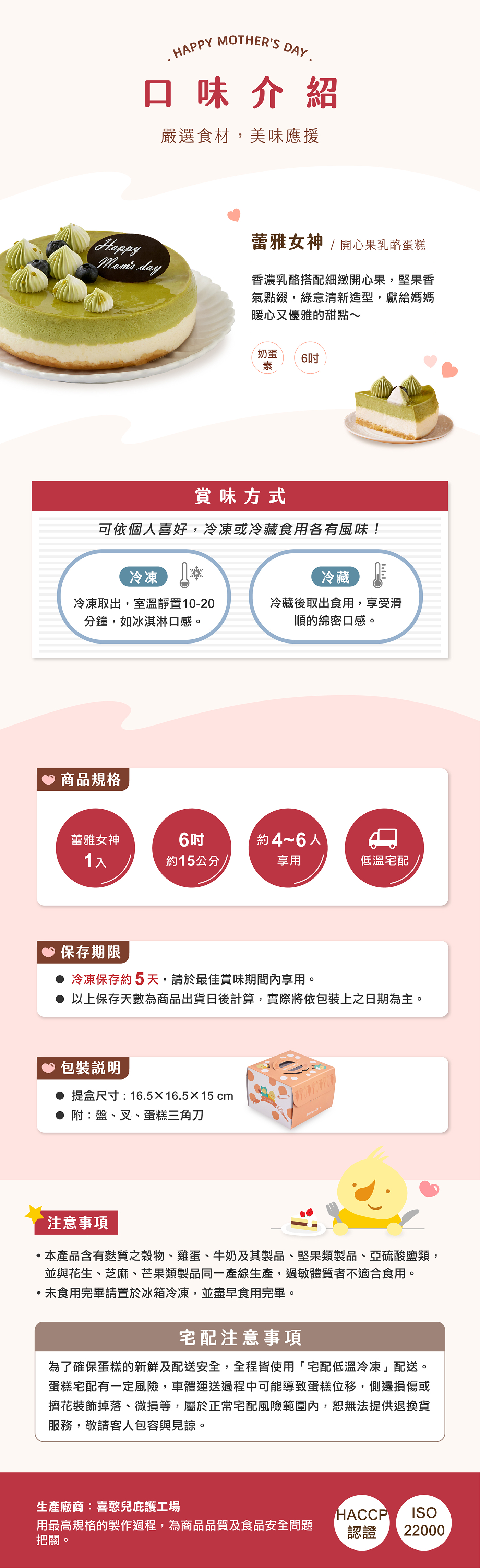 ✦內容物:蕾雅女神.開心果乳酪蛋糕6吋x1