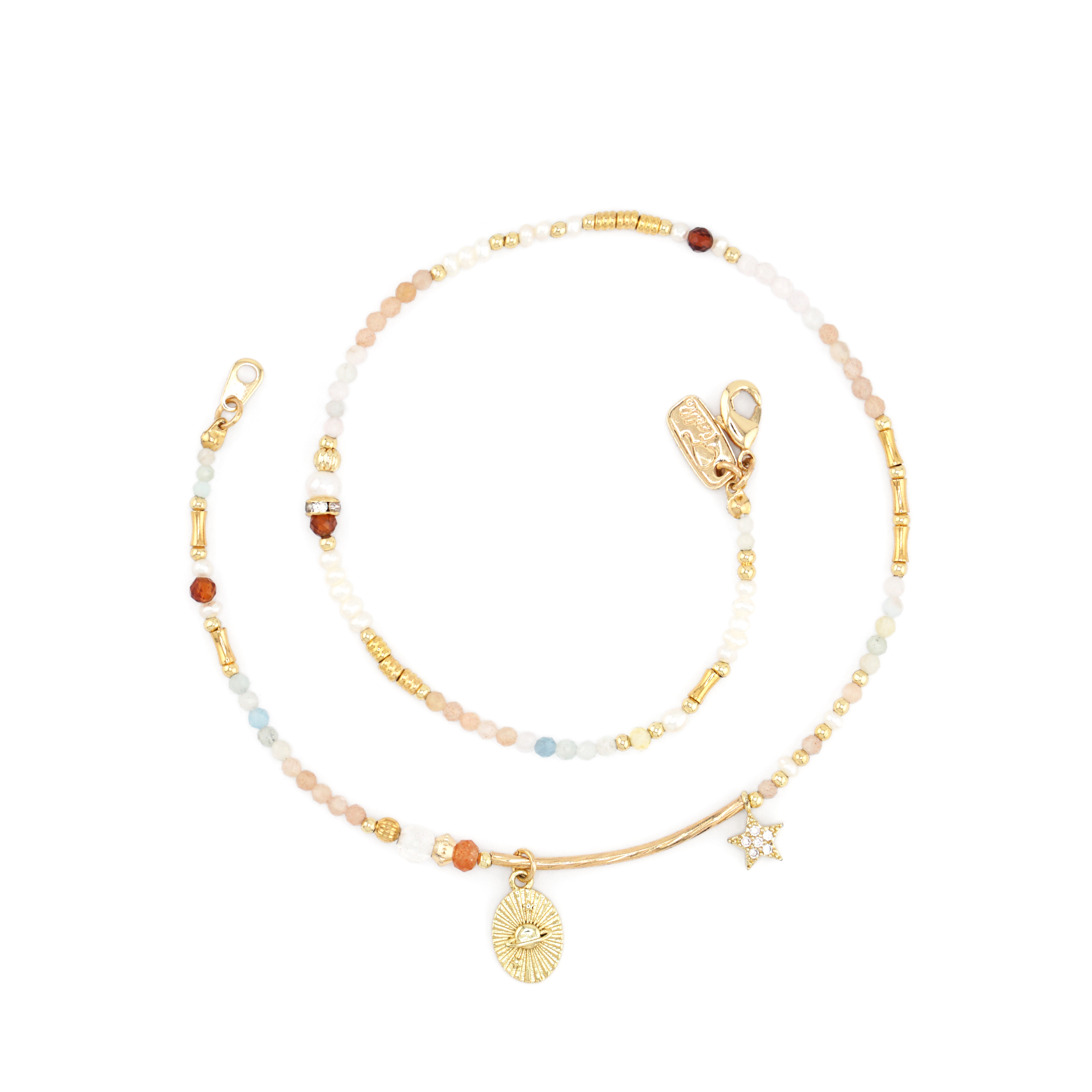 – 商品材質 Product Materials –摩根石、太陽石、淡水珍珠、黃水晶、橙石榴石、鋯石、金草莓晶、海藍寶、黃銅鍍18K金