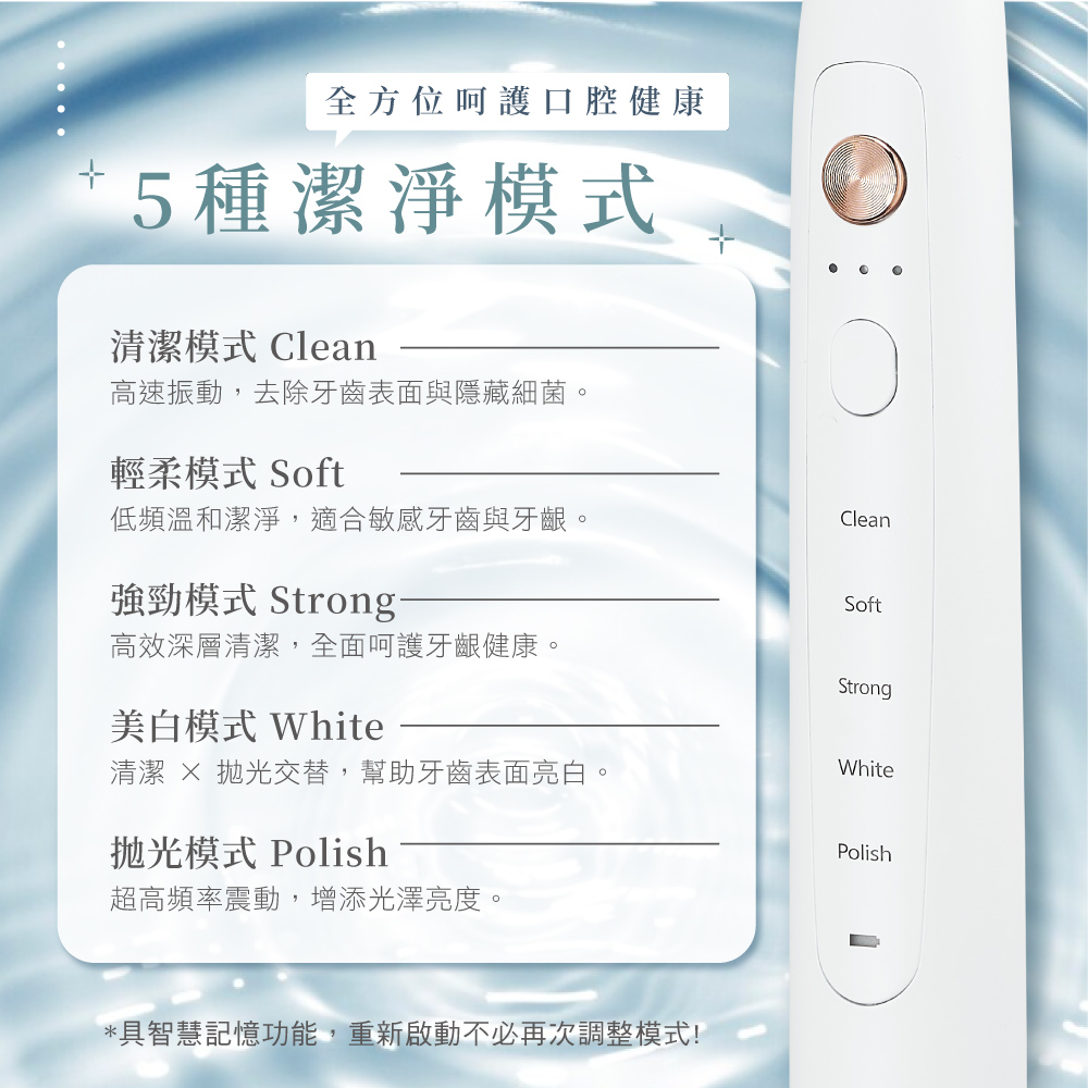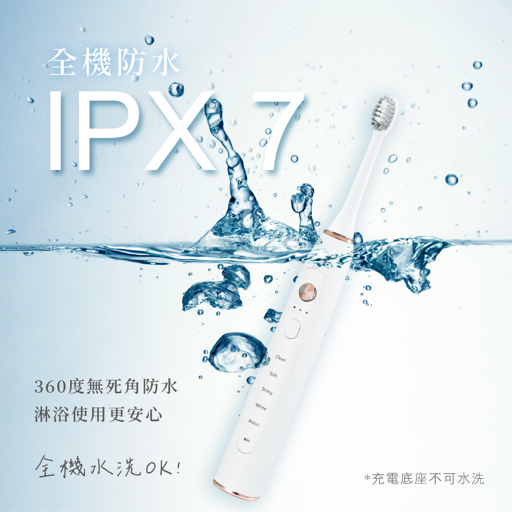 5種模式 × 3段強度 × 杜邦刷毛 × IPX7防水