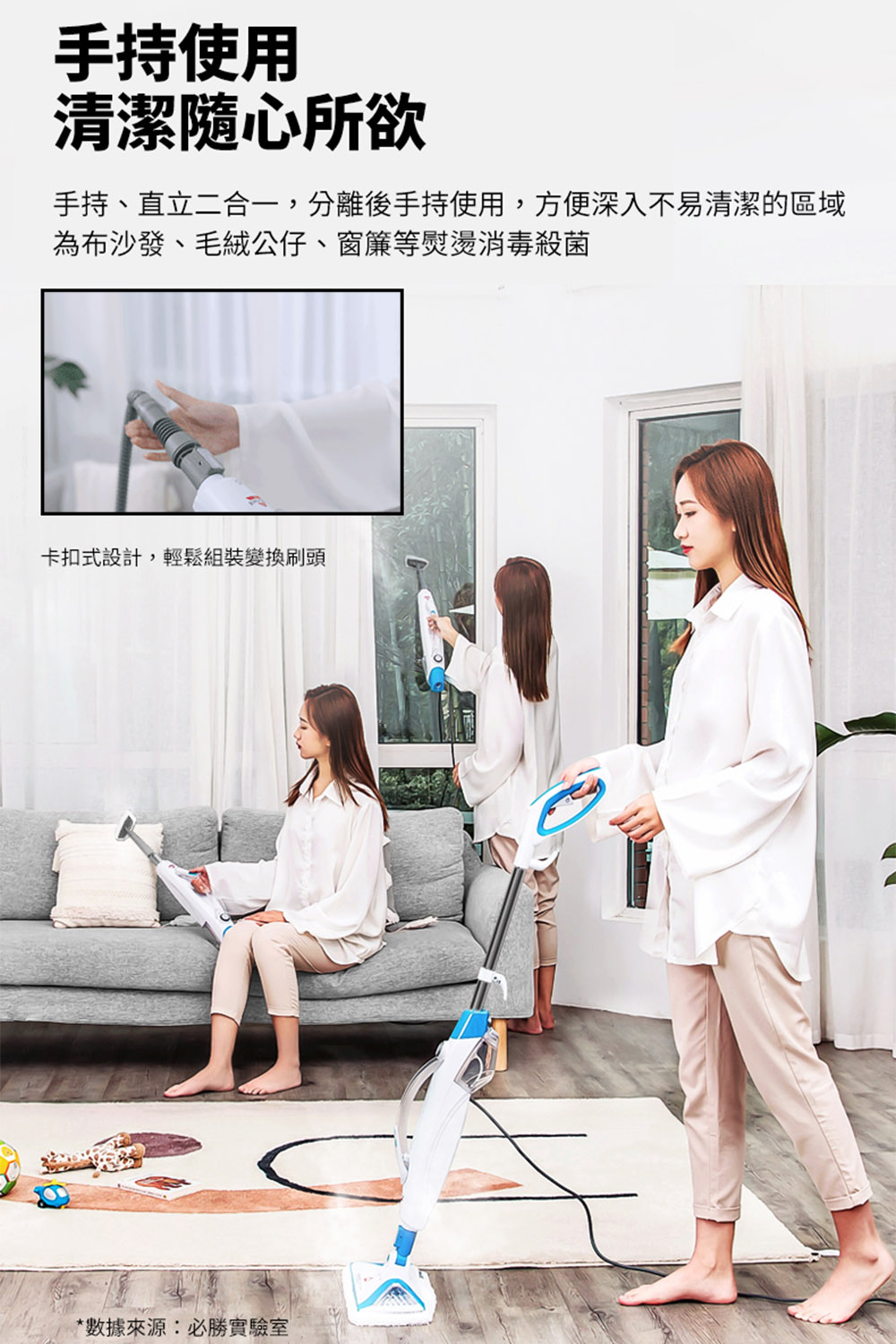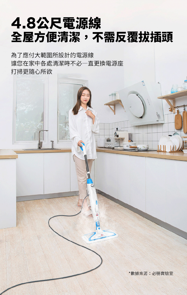 ※ 注意:蒸氣清潔用品不建議使用在海島型地板和實木地板上,因為可能會造成些許清潔痕跡,使用前請於不顯眼處先做測試評估是否適用,謝謝。