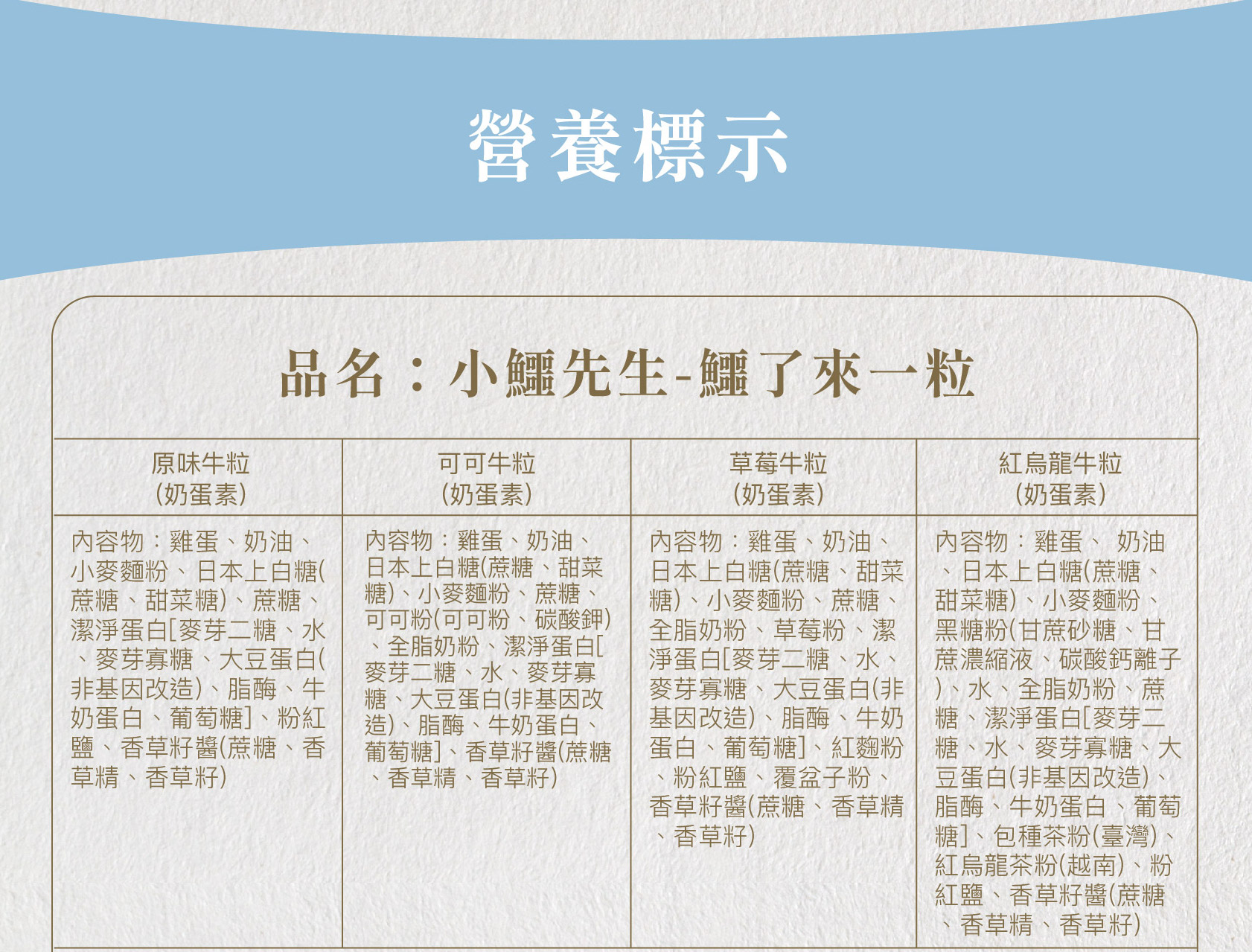 過敏原:本產品含有牛奶、雞蛋、大豆、麩質之穀物