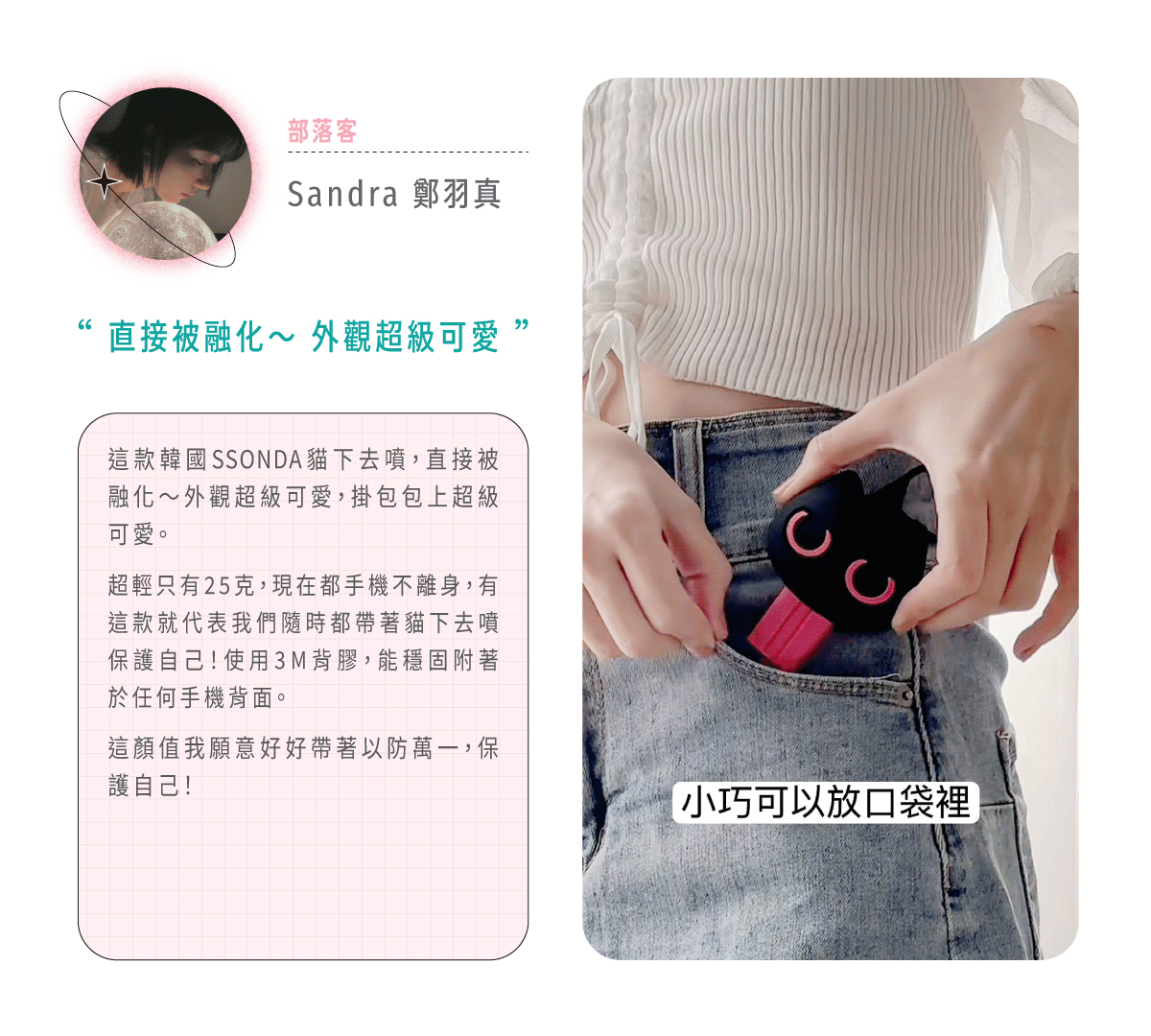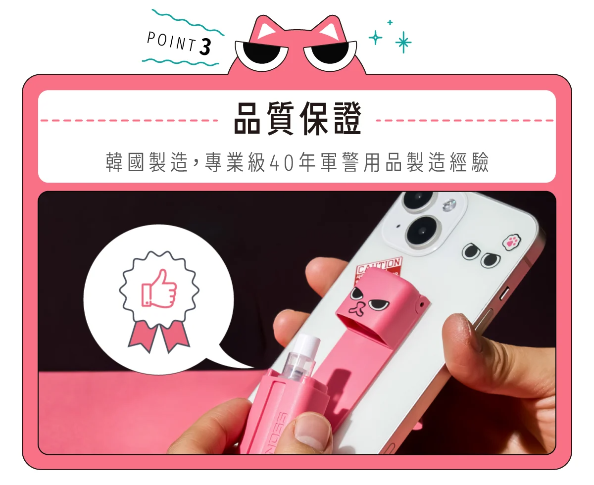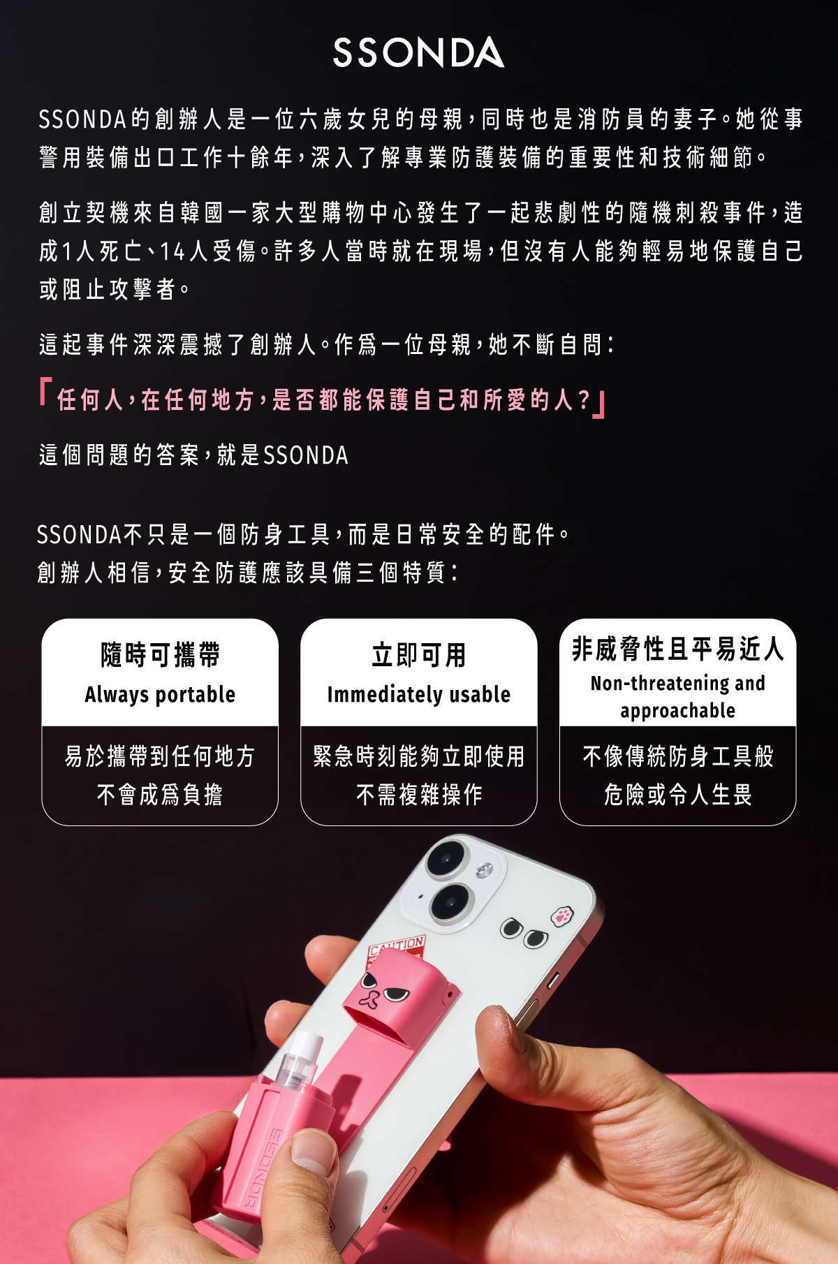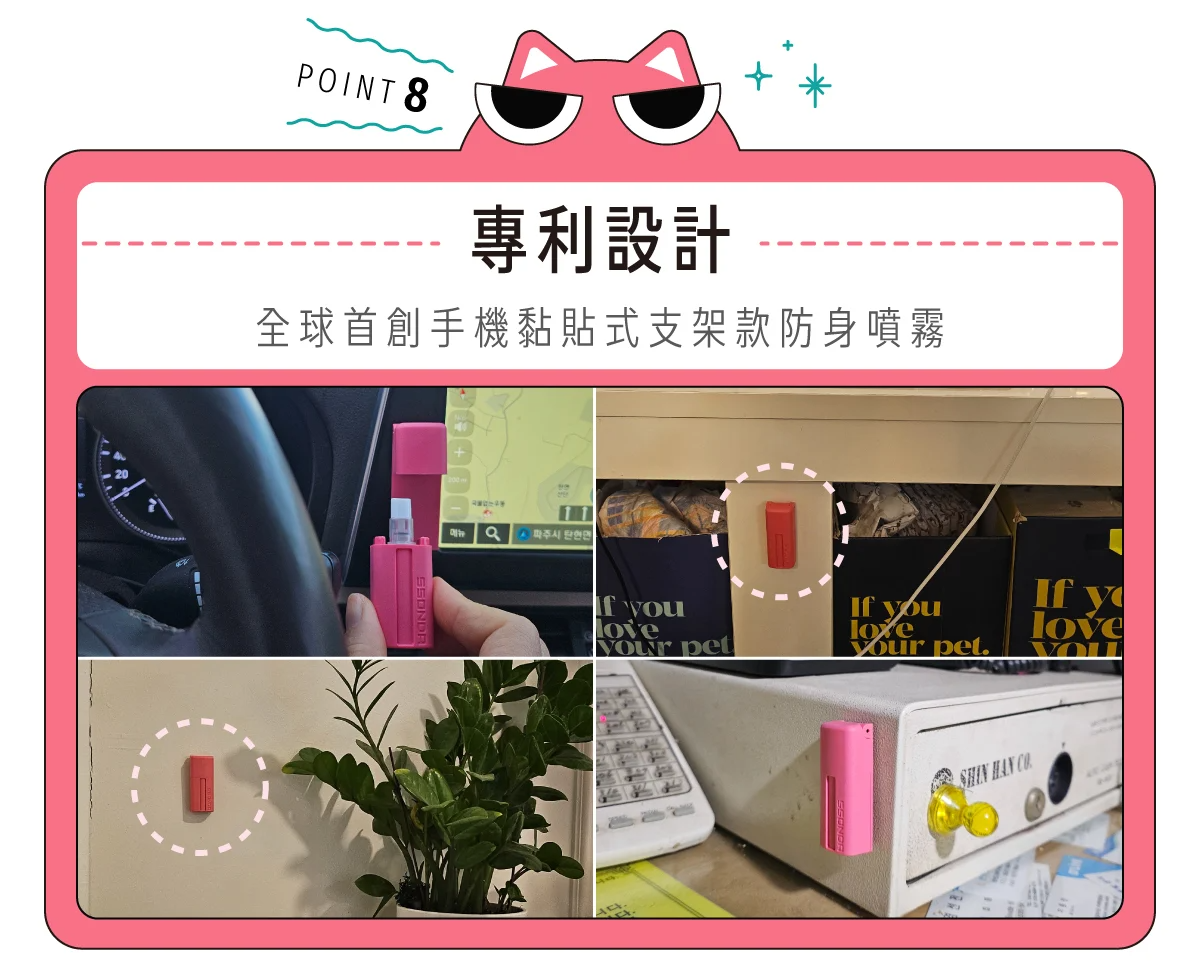 ▲ 黏貼式設計獲得韓國🇰🇷 專利認證,手機到哪防護到哪!SSONDA TOK為全球首創手機黏貼式防身噴霧,不用時還能當手機支架,一物多用超貼心。使用3M背膠,穩固附著於任何手機背面,不傷機身。亦可黏貼在汽車、居家方便取得之處。