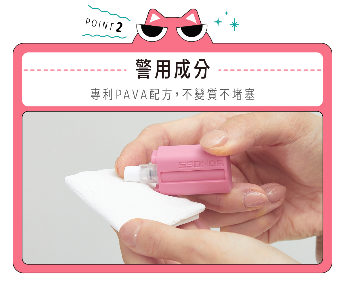 不再龐大!每天帶出門也零存在感!儘管SSONDA體積小巧,但仍能保持精確、穩定的噴射距離,確保在真實危險情況下立即採取有效防禦!
