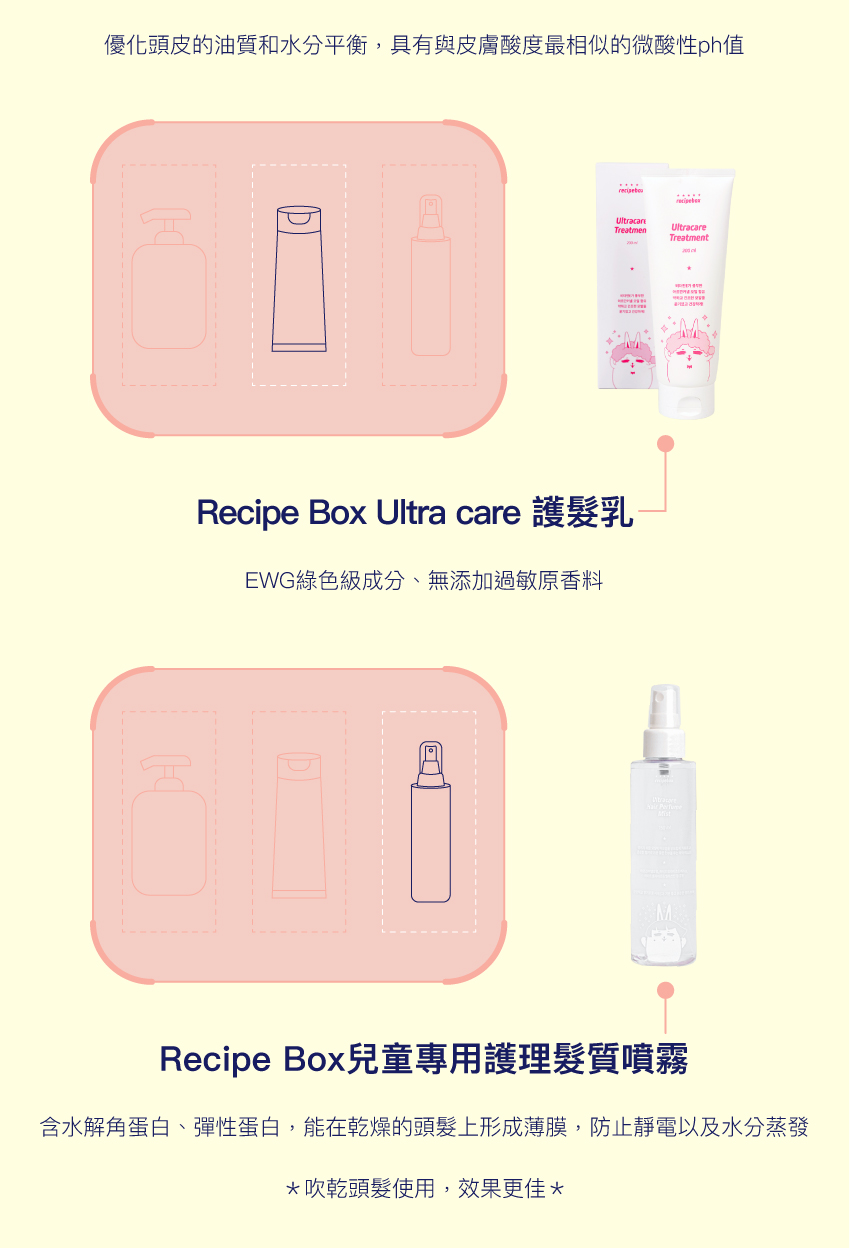 • 兒童護理髮質噴霧→ 含水解角蛋白、彈性蛋白→ 防靜電、鎖水分,維持柔順光澤