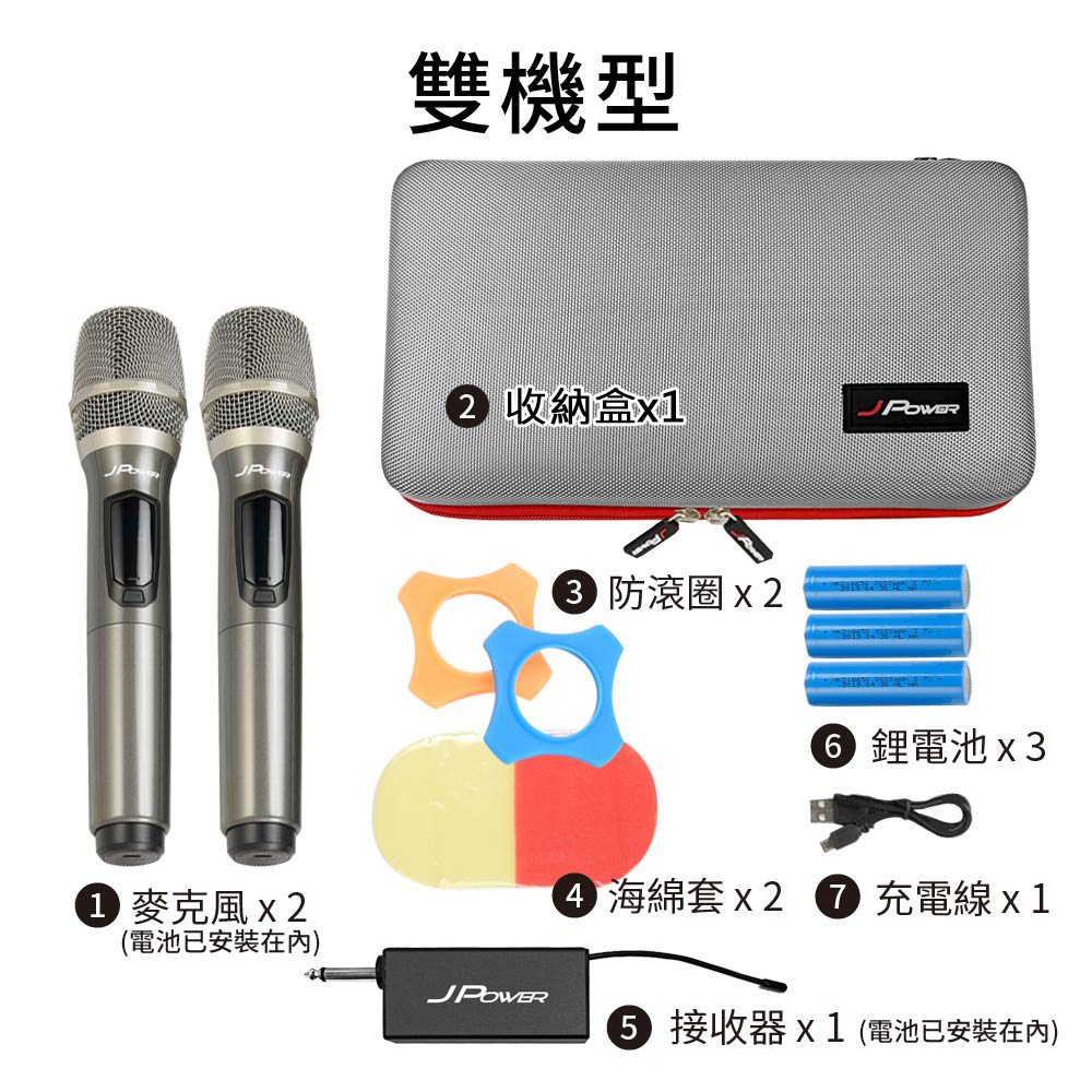 配件:無線麥克風x2、無線接收器x1、鋰電池x3、充電線x1、防滾套x2、海綿套x2、3.5mm轉接頭x1、說明書x1、收納包x1