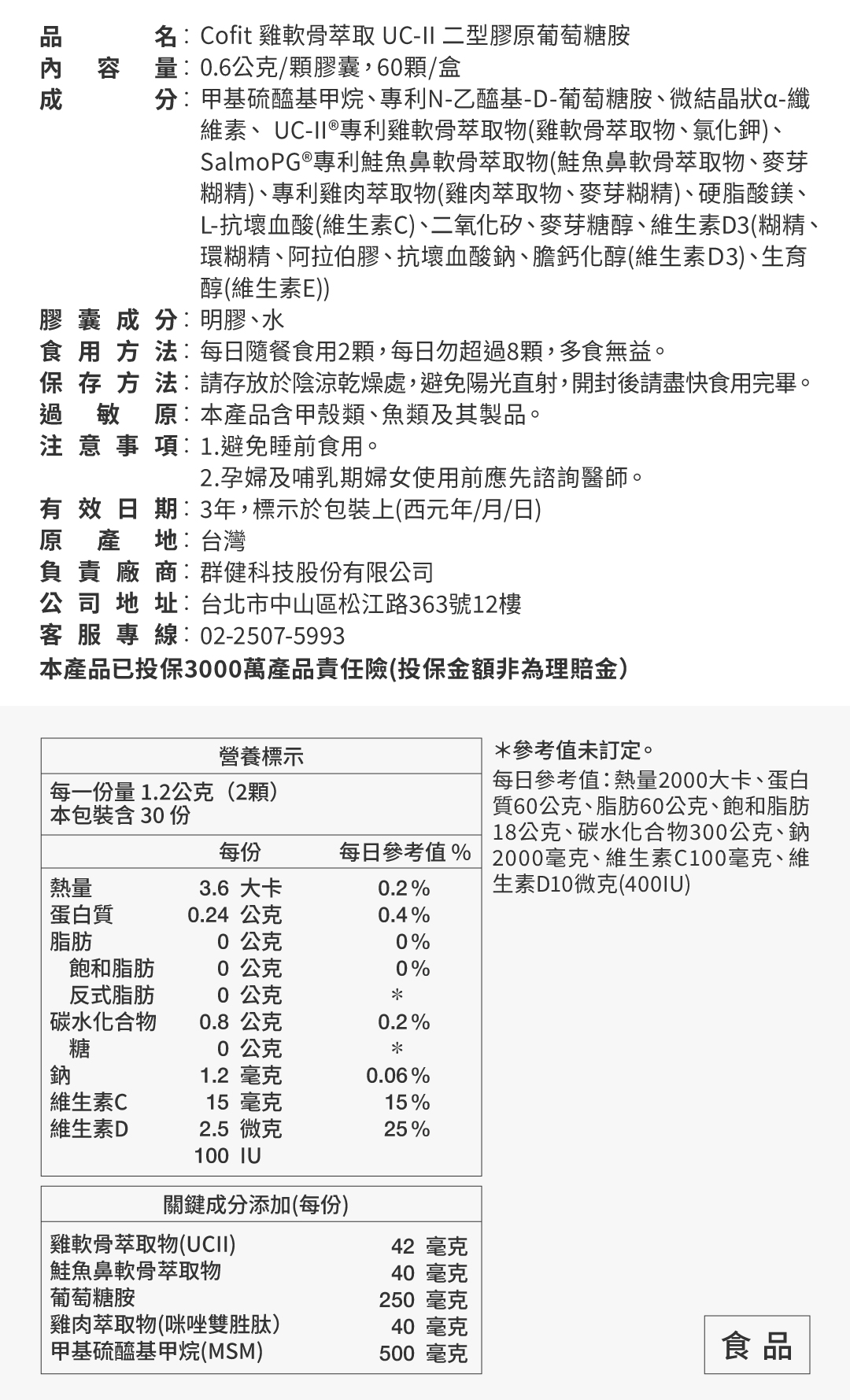 商品名: UC-II 膠原葡萄糖胺(60顆/瓶/盒)