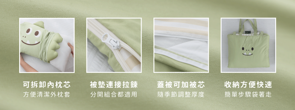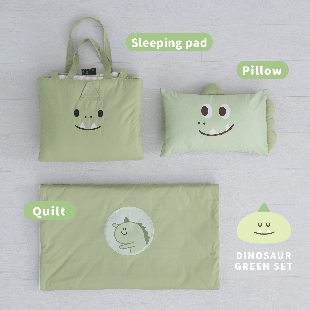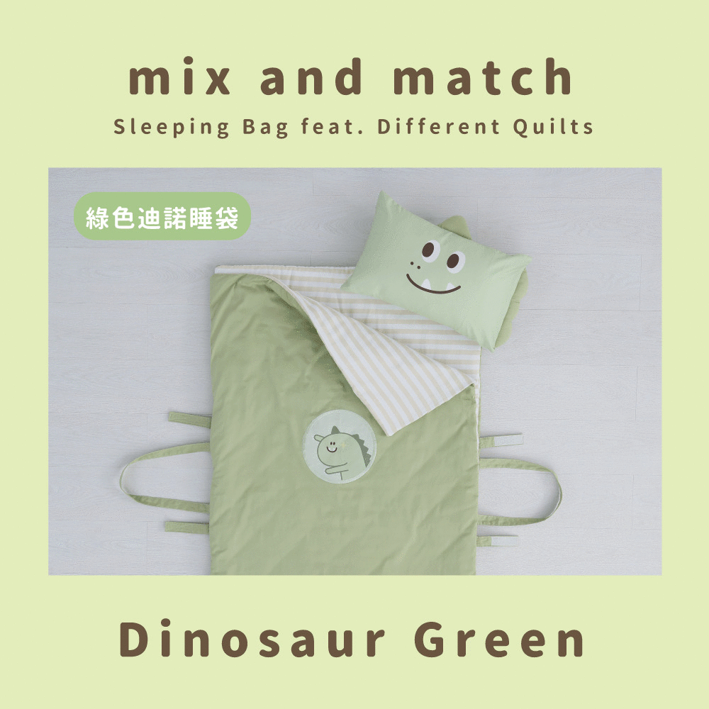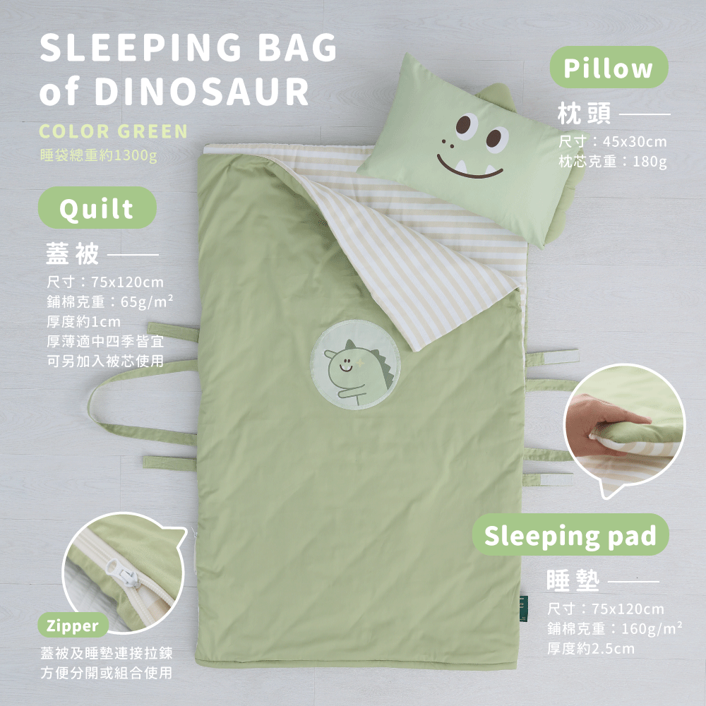 ●款式:綠色龍龍迪諾●內容物:舒適睡墊x1+柔軟蓋被x1+動物造型枕x1+防水提袋x1●適用年齡:2歲以上●商品規格:睡墊、蓋被(75 x 120cm)/ 枕頭(45 x 30cm)/ 防水提袋(35 x 40 x 17cm)●材質:睡墊、蓋被(表布 - 100% 棉、裡布填充物 - 100% 聚酯纖維)/ 枕頭(枕套-100% 棉、枕芯-100% 聚酯纖維)●產地:台灣【注意事項】