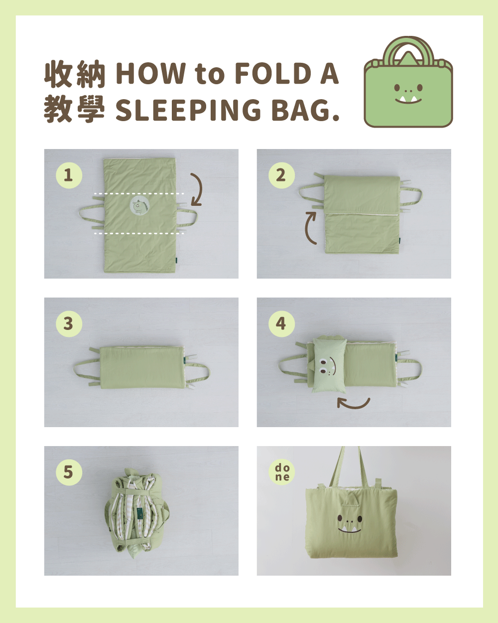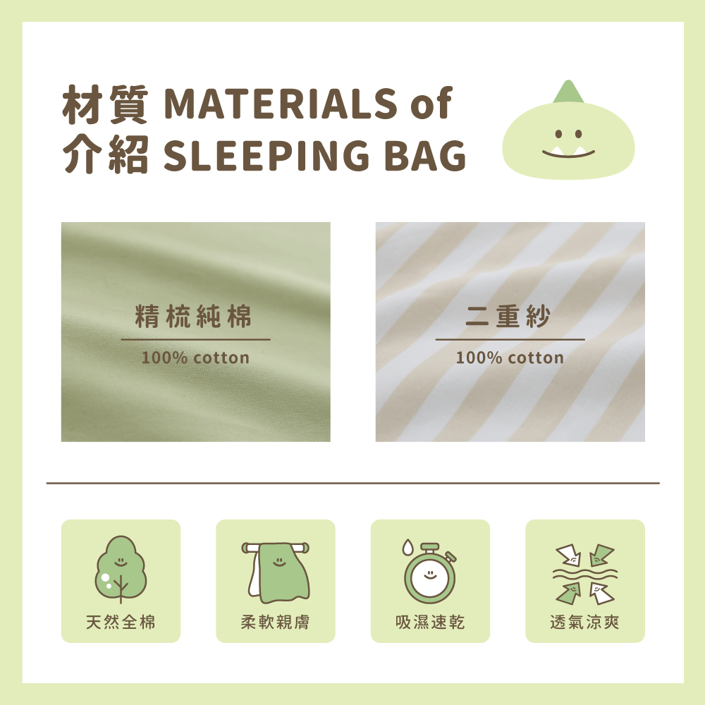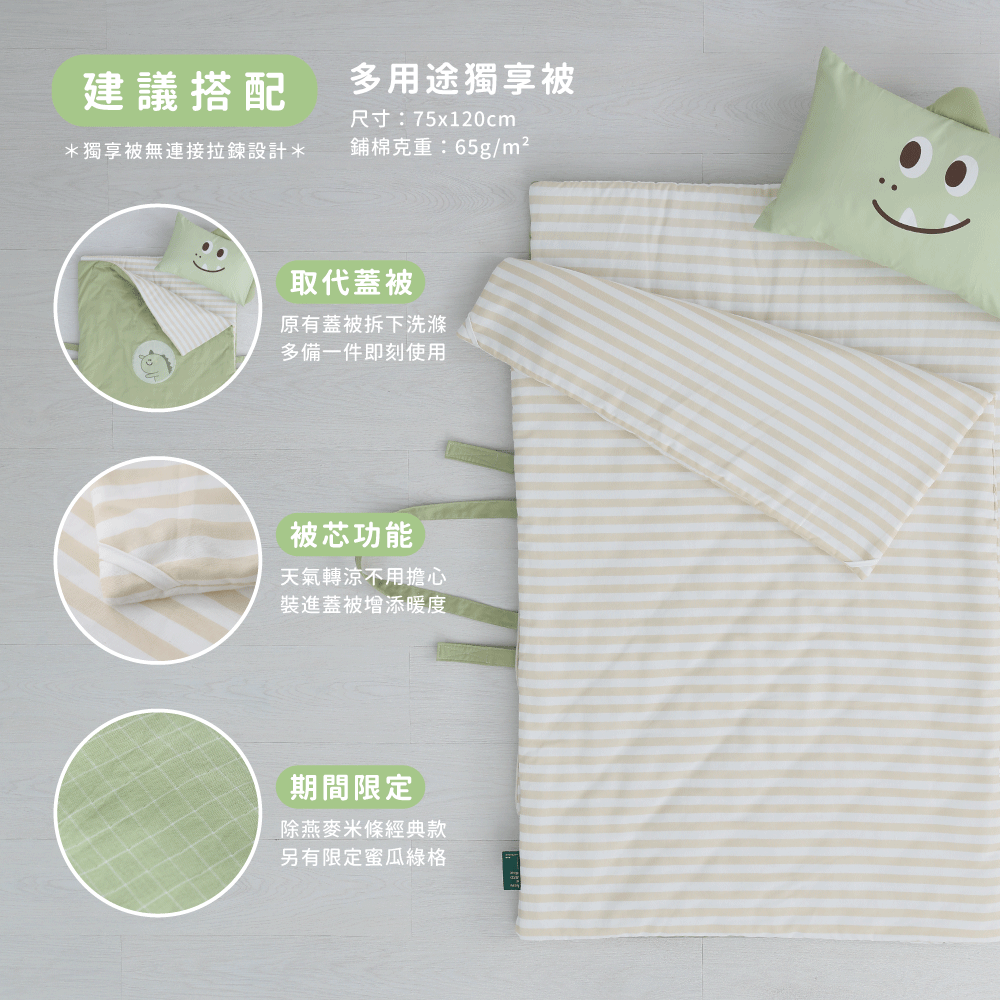 ●款式:綠色龍龍迪諾●內容物:舒適睡墊x1+柔軟蓋被x1+動物造型枕x1+防水提袋x1●適用年齡:2歲以上●商品規格:睡墊、蓋被(75 x 120cm)/ 枕頭(45 x 30cm)/ 防水提袋(35 x 40 x 17cm)●材質:睡墊、蓋被(表布 - 100% 棉、裡布填充物 - 100% 聚酯纖維)/ 枕頭(枕套-100% 棉、枕芯-100% 聚酯纖維)●產地:台灣【注意事項】
