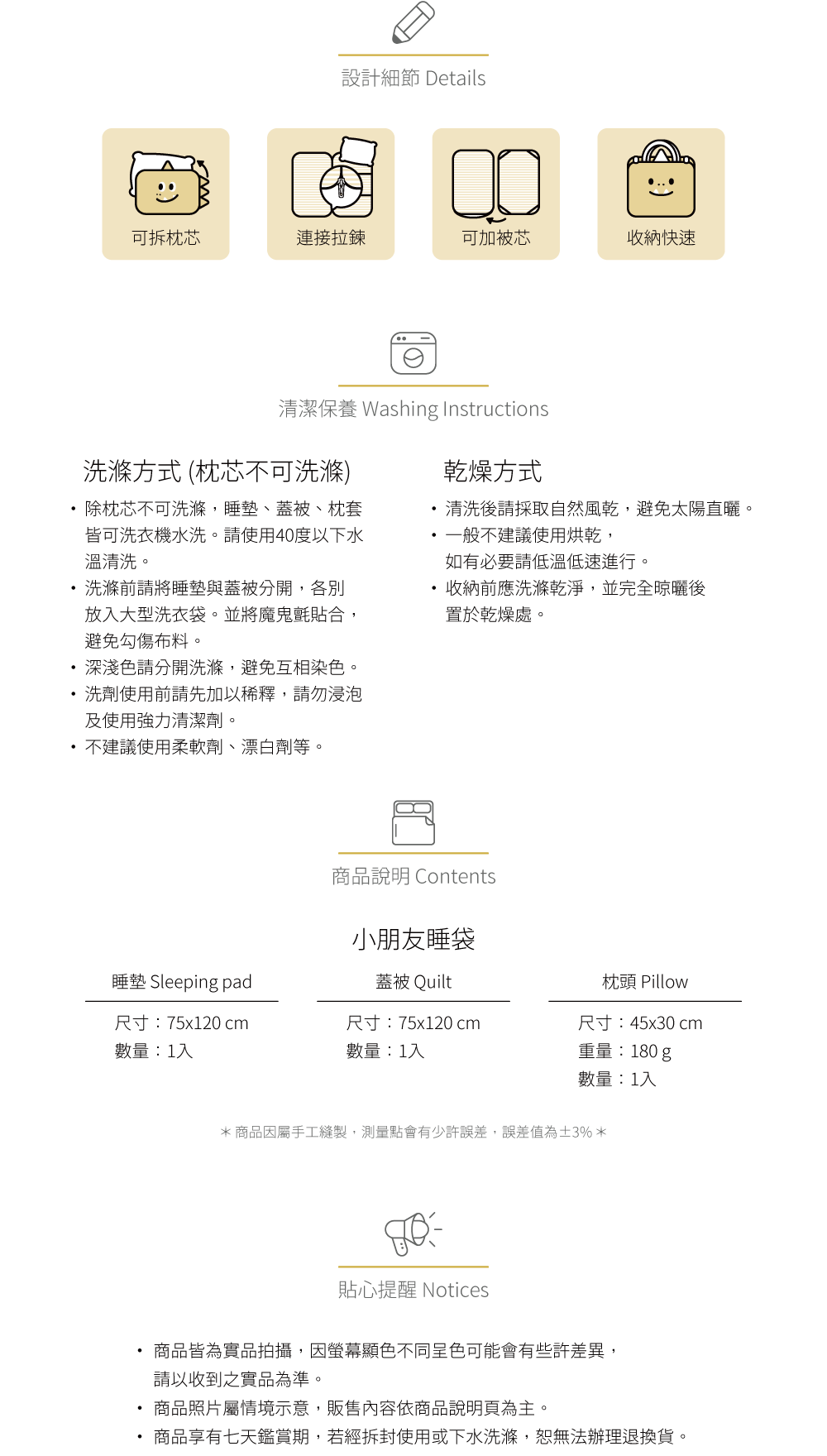 ●洗滌前請務必詳細閱讀洗滌說明,依說明進行適當的清洗●除枕芯不可洗滌,睡墊、蓋被、枕套皆可洗衣機水洗●水洗時請依洗滌量放入適當水量,並使用40度以下水溫清洗;深淺色請分開洗滌,避免互相染色;不建議使用柔軟劑、漂白劑等●洗滌前請將睡墊與蓋被分開,各別放入大型洗衣袋,並將睡袋魔鬼氈勾面及毛面貼合,以減少摩擦或勾傷布料,降低起球機率及強力拉扯而造成的毀損●請使用中性洗劑並加以稀釋,勿浸泡睡袋組及使用強力清潔劑,以避免洗劑殘留於床寢產生褪色痕跡或破壞●一般不建議使用烘乾,如有必要請低溫低速進行●收納前應洗滌乾淨,清洗後請完全晾曬於乾燥處自然風乾,避免太陽直曬●商品皆為實品拍攝,因螢幕顯色不同呈色可能會有些許差異,請以收到之實品為準●商品照片屬情境示意,販售內容依商品說明頁為主●商品享有七天鑑賞期,若經拆封使用或下水洗滌,恕無法辦理退換貨