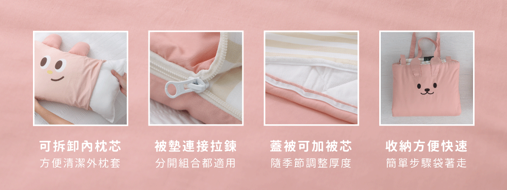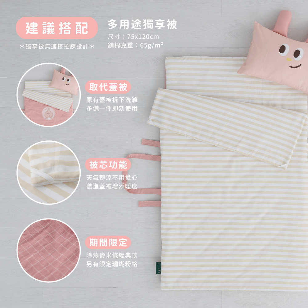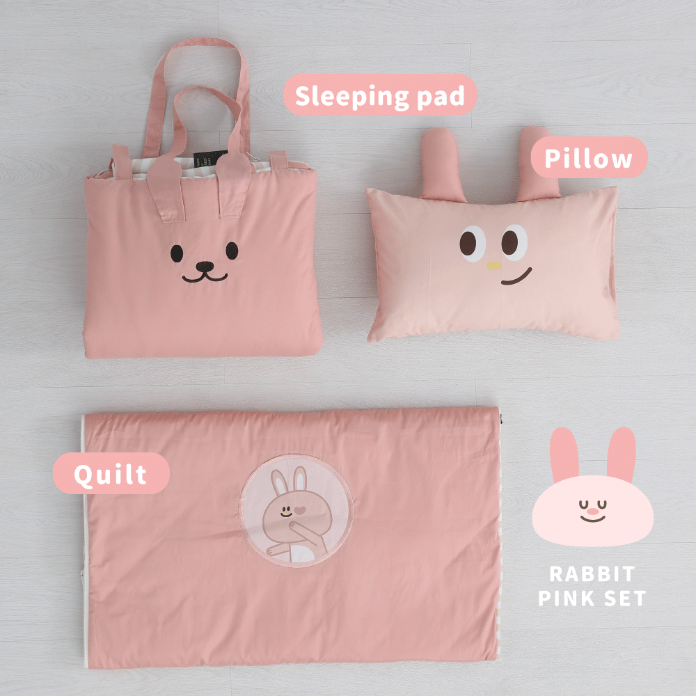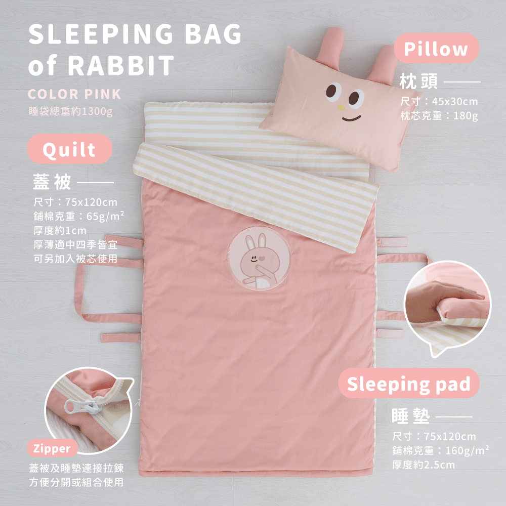 ●款式:粉色兔兔芮比●內容物:舒適睡墊x1+柔軟蓋被x1+動物造型枕x1+防水提袋x1●適用年齡:2歲以上●商品規格:睡墊、蓋被(75 x 120cm)/ 枕頭(45 x 30cm)/ 防水提袋(35 x 40 x 17cm)●材質:睡墊、蓋被(表布 - 100% 棉、裡布填充物 - 100% 聚酯纖維)/ 枕頭(枕套-100% 棉、枕芯-100% 聚酯纖維)●產地:台灣【注意事項】