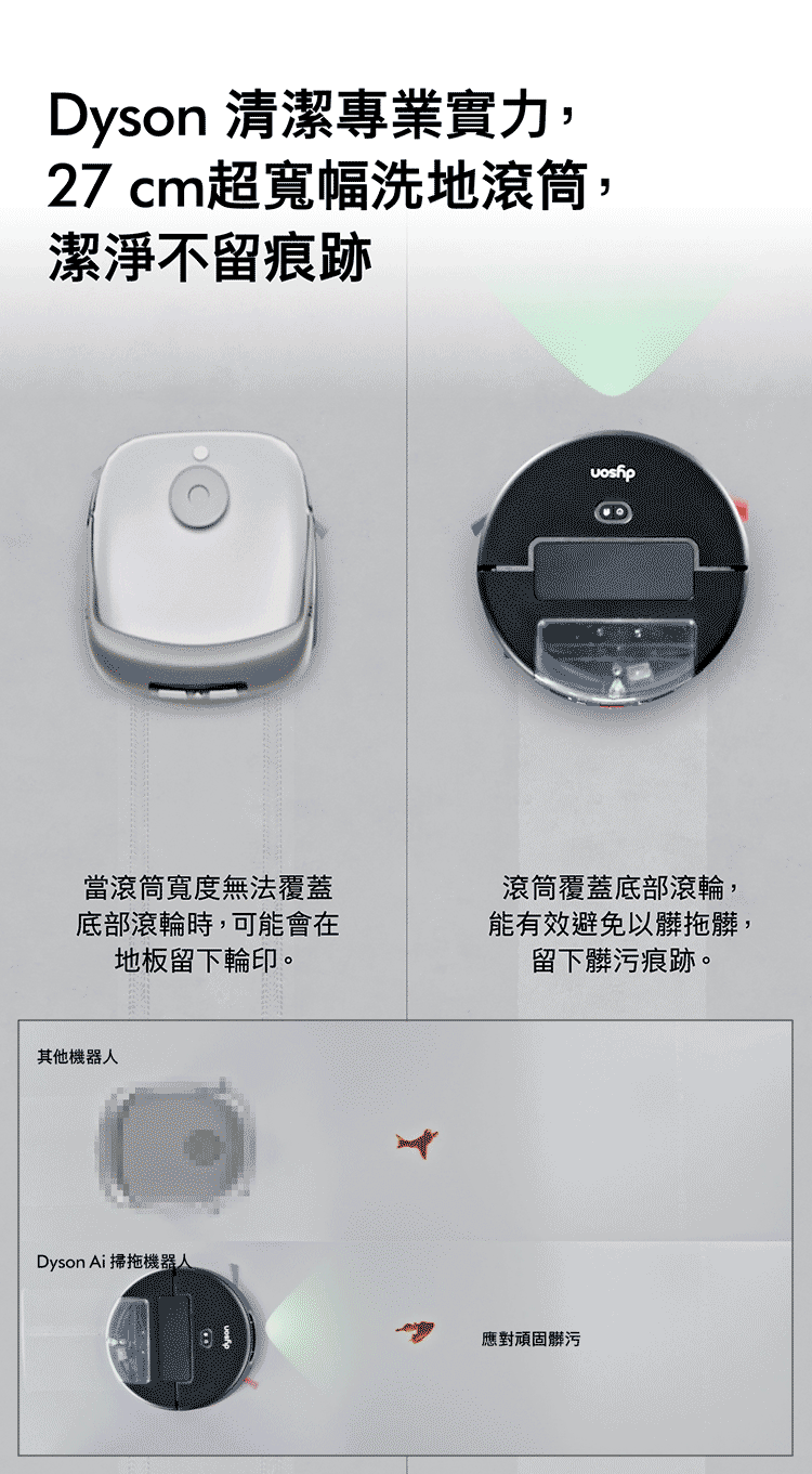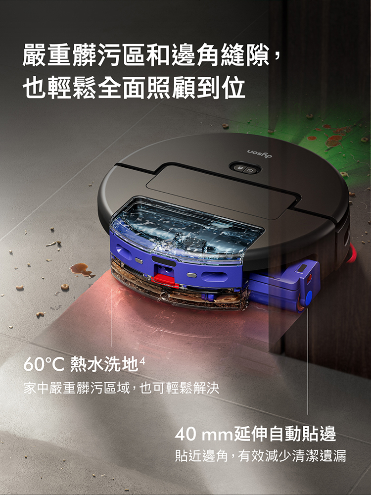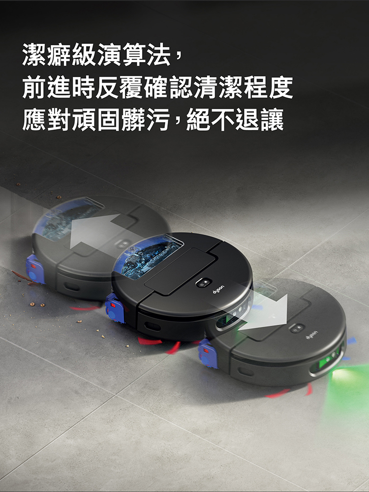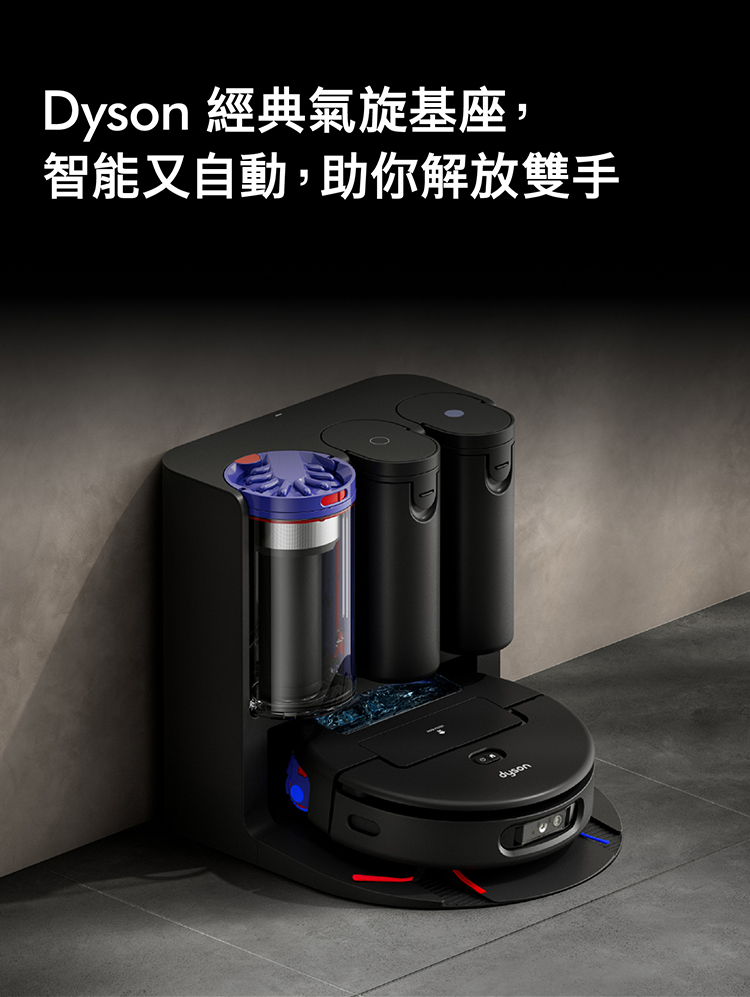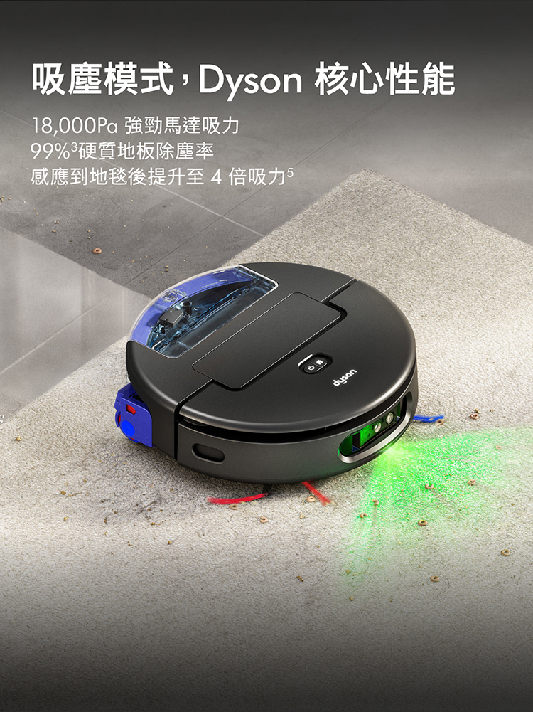★Ai偵測清潔,直到徹底潔淨,不乾淨不收工每秒偵測環境7次,潔癖級演算法,前進時反覆確認清潔程度,夠乾淨才前進。★Ai智慧感測系統,精準辨識近200種物品Dyson Ai處理器結合LiDAR雙重雷射光、經典智慧光學偵測,每秒萬億次運算能力,瞬間制定清潔行程,並持續學習進化,辨識精準度提升40%。★27cm 超寬幅洗地滾筒,潔淨不留痕跡滾筒覆蓋底部滾輪,能有效避免以髒拖髒,留下髒污痕跡。★12點釋放60°C熱活水洗地滾筒旋轉時自清潔,確保乾淨清水洗地,家中嚴重髒污區域,也可輕鬆解決。★滾筒40 mm延伸自動貼邊邊角縫隙也能輕鬆全面照顧到位,有效減少清潔遺漏。★吸塵模式,Dyson核心性能18,000pa強勁馬達吸力,99%硬質地板除塵率,感應到地毯後提升至4倍吸力。★避免毛髮纏繞與精準清潔複合吸塵刷條能避免毛髮纏繞,旋轉邊刷精準刮除牆角及狹窄縫隙微塵。滾筒感應到地毯後,自動抬升10 mm,避免弄濕地毯。★Dyson經典氣旋基座,智能又自動集塵筒獨特氣旋設計,確保強勁吸力不衰減,環保零塵袋耗材。超大容量集塵筒100天免傾倒灰塵,基座濾網可捕捉小至0.1微米的灰塵及超細微粒。 ★基座自清潔,助你解放雙手60°C熱清水清洗滾筒,能深度清潔滾筒。45°C熱風烘乾有效避免形成易滋生細菌的潮濕環境。基座會自動添加適量清潔劑,抑菌效果高達99.9%。 ★於MyDyson APP中快速建圖智能分區,清潔需求即時處理智慧辨別房間類型,並透過分區地圖,檢查全家清潔狀態。設置虛擬界線防止機器人進入禁行區域。可自訂指定時段清潔特定區域。★嚴格保護數據,隱私安全有保障先進的Ai系統全程於安全環境內運算,無需透過雲端,更不會將圖像儲存在機器中,確保數據安全。