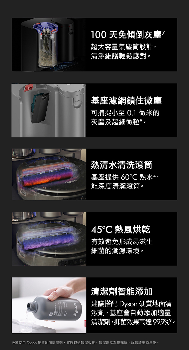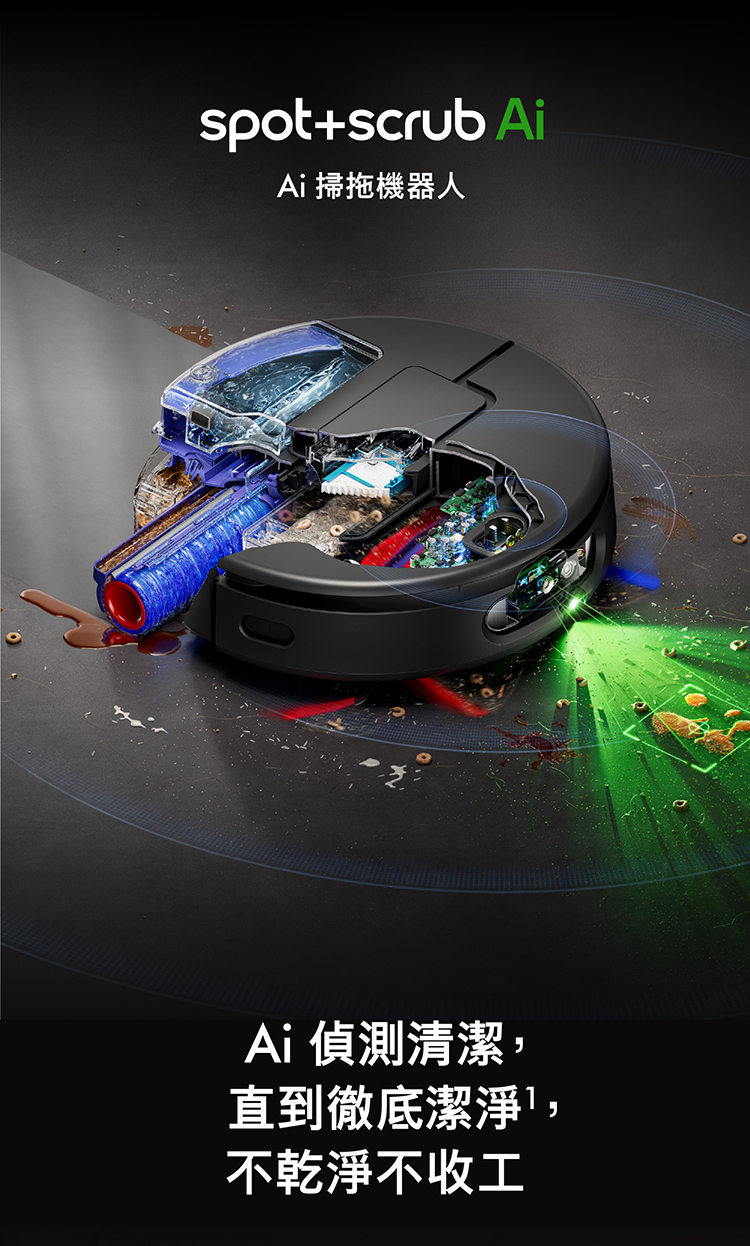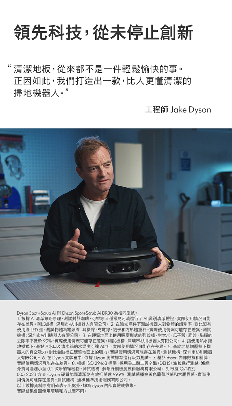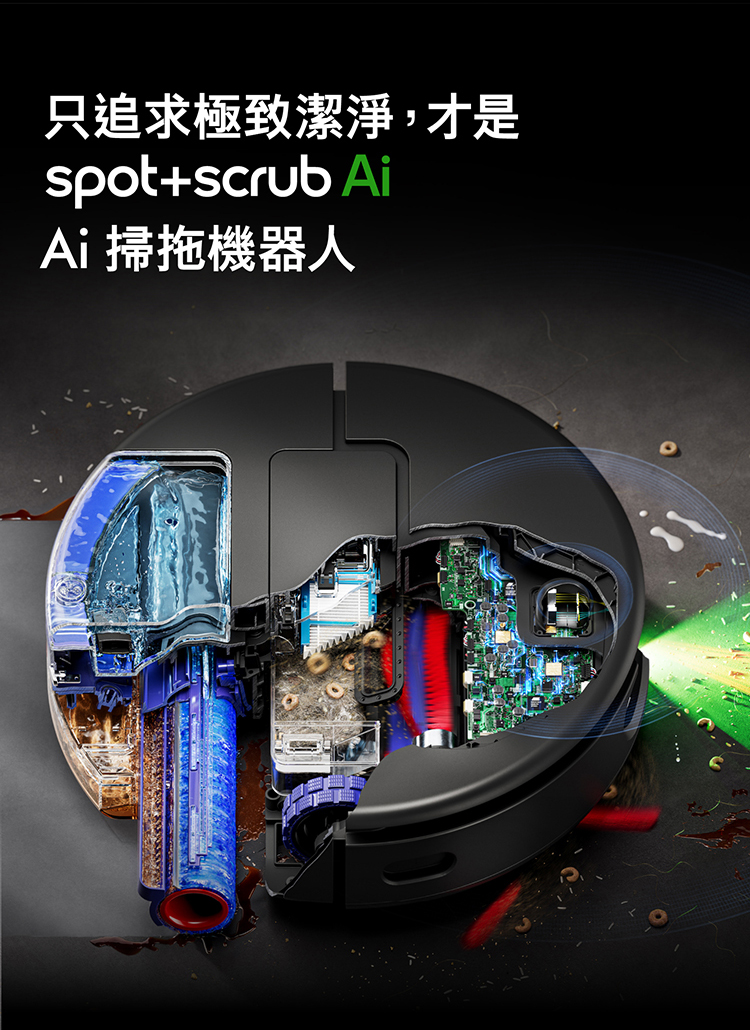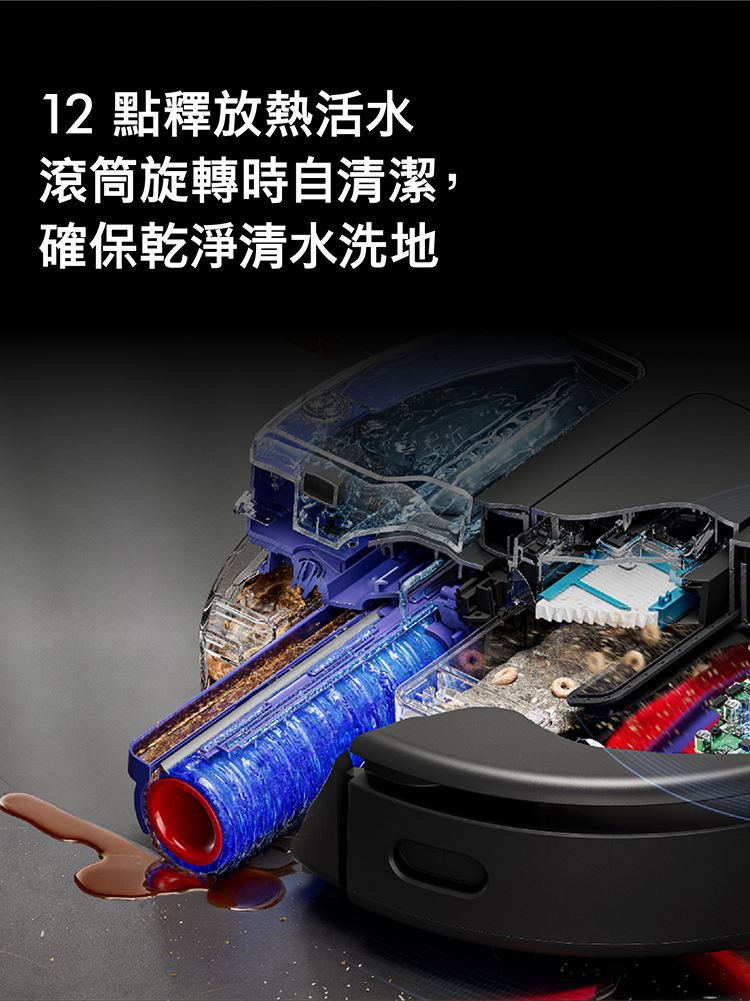 ★Ai偵測清潔,直到徹底潔淨,不乾淨不收工每秒偵測環境7次,潔癖級演算法,前進時反覆確認清潔程度,夠乾淨才前進。★Ai智慧感測系統,精準辨識近200種物品Dyson Ai處理器結合LiDAR雙重雷射光、經典智慧光學偵測,每秒萬億次運算能力,瞬間制定清潔行程,並持續學習進化,辨識精準度提升40%。★27cm 超寬幅洗地滾筒,潔淨不留痕跡滾筒覆蓋底部滾輪,能有效避免以髒拖髒,留下髒污痕跡。★12點釋放60°C熱活水洗地滾筒旋轉時自清潔,確保乾淨清水洗地,家中嚴重髒污區域,也可輕鬆解決。★滾筒40 mm延伸自動貼邊邊角縫隙也能輕鬆全面照顧到位,有效減少清潔遺漏。★吸塵模式,Dyson核心性能18,000pa強勁馬達吸力,99%硬質地板除塵率,感應到地毯後提升至4倍吸力。★避免毛髮纏繞與精準清潔複合吸塵刷條能避免毛髮纏繞,旋轉邊刷精準刮除牆角及狹窄縫隙微塵。滾筒感應到地毯後,自動抬升10 mm,避免弄濕地毯。★Dyson經典氣旋基座,智能又自動集塵筒獨特氣旋設計,確保強勁吸力不衰減,環保零塵袋耗材。超大容量集塵筒100天免傾倒灰塵,基座濾網可捕捉小至0.1微米的灰塵及超細微粒。 ★基座自清潔,助你解放雙手60°C熱清水清洗滾筒,能深度清潔滾筒。45°C熱風烘乾有效避免形成易滋生細菌的潮濕環境。基座會自動添加適量清潔劑,抑菌效果高達99.9%。 ★於MyDyson APP中快速建圖智能分區,清潔需求即時處理智慧辨別房間類型,並透過分區地圖,檢查全家清潔狀態。設置虛擬界線防止機器人進入禁行區域。可自訂指定時段清潔特定區域。★嚴格保護數據,隱私安全有保障先進的Ai系統全程於安全環境內運算,無需透過雲端,更不會將圖像儲存在機器中,確保數據安全。