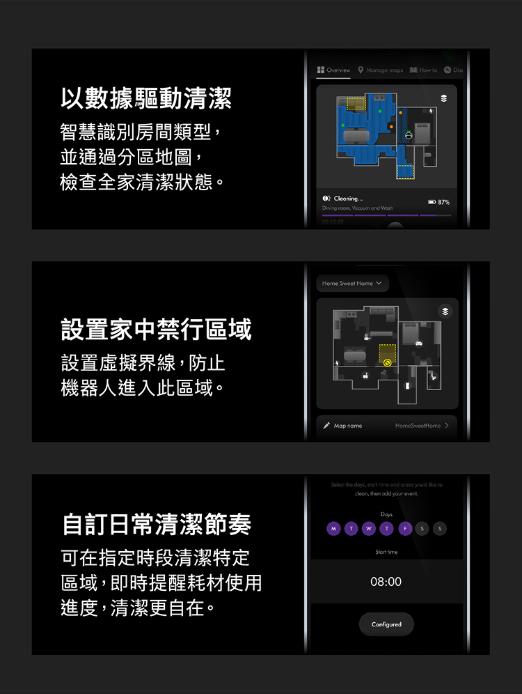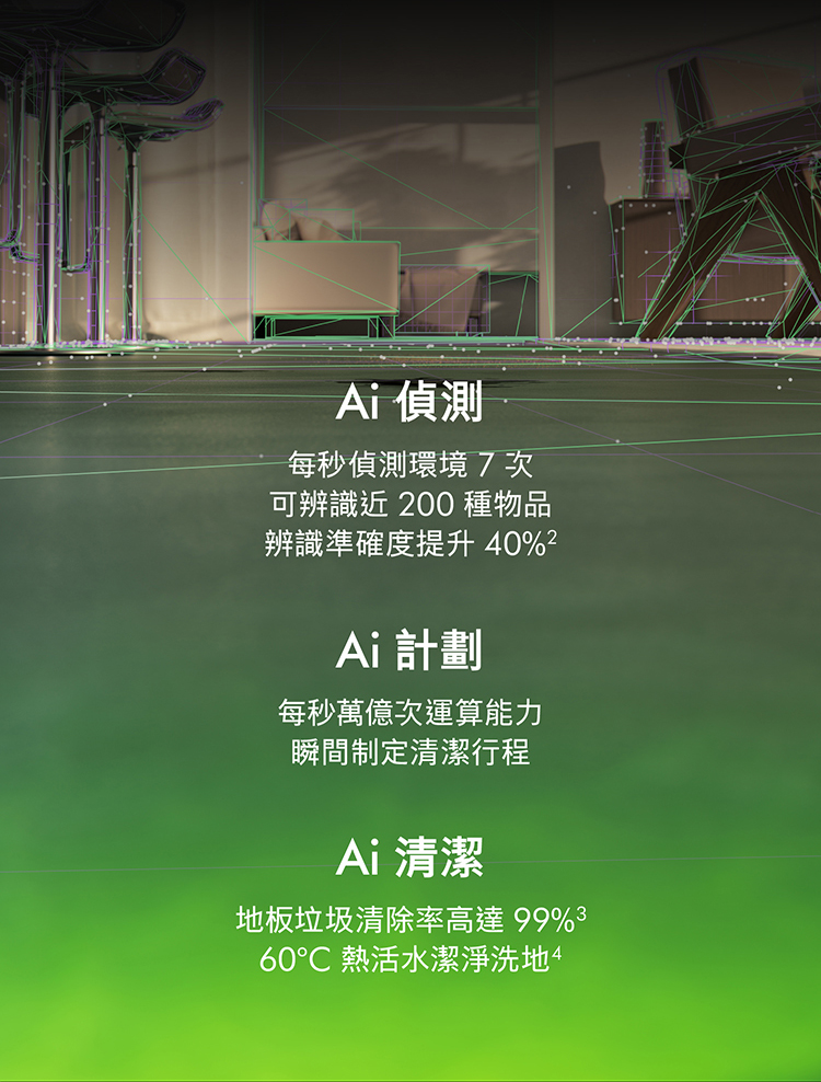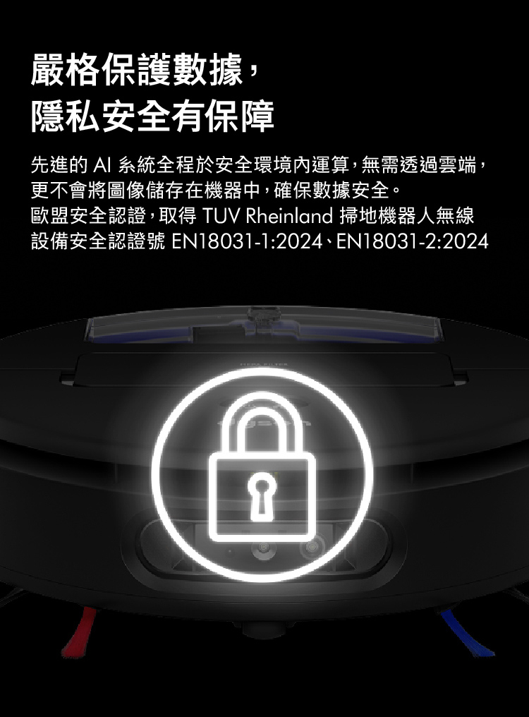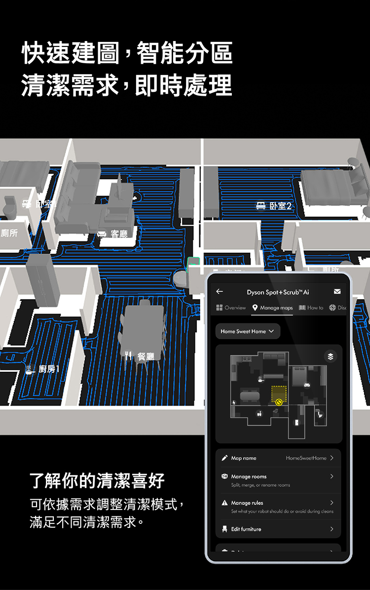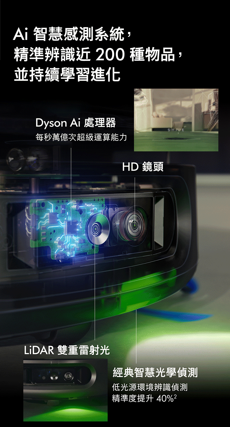 ★Ai偵測清潔,直到徹底潔淨,不乾淨不收工每秒偵測環境7次,潔癖級演算法,前進時反覆確認清潔程度,夠乾淨才前進。★Ai智慧感測系統,精準辨識近200種物品Dyson Ai處理器結合LiDAR雙重雷射光、經典智慧光學偵測,每秒萬億次運算能力,瞬間制定清潔行程,並持續學習進化,辨識精準度提升40%。★27cm 超寬幅洗地滾筒,潔淨不留痕跡滾筒覆蓋底部滾輪,能有效避免以髒拖髒,留下髒污痕跡。★12點釋放60°C熱活水洗地滾筒旋轉時自清潔,確保乾淨清水洗地,家中嚴重髒污區域,也可輕鬆解決。★滾筒40 mm延伸自動貼邊邊角縫隙也能輕鬆全面照顧到位,有效減少清潔遺漏。★吸塵模式,Dyson核心性能18,000pa強勁馬達吸力,99%硬質地板除塵率,感應到地毯後提升至4倍吸力。★避免毛髮纏繞與精準清潔複合吸塵刷條能避免毛髮纏繞,旋轉邊刷精準刮除牆角及狹窄縫隙微塵。滾筒感應到地毯後,自動抬升10 mm,避免弄濕地毯。★Dyson經典氣旋基座,智能又自動集塵筒獨特氣旋設計,確保強勁吸力不衰減,環保零塵袋耗材。超大容量集塵筒100天免傾倒灰塵,基座濾網可捕捉小至0.1微米的灰塵及超細微粒。 ★基座自清潔,助你解放雙手60°C熱清水清洗滾筒,能深度清潔滾筒。45°C熱風烘乾有效避免形成易滋生細菌的潮濕環境。基座會自動添加適量清潔劑,抑菌效果高達99.9%。 ★於MyDyson APP中快速建圖智能分區,清潔需求即時處理智慧辨別房間類型,並透過分區地圖,檢查全家清潔狀態。設置虛擬界線防止機器人進入禁行區域。可自訂指定時段清潔特定區域。★嚴格保護數據,隱私安全有保障先進的Ai系統全程於安全環境內運算,無需透過雲端,更不會將圖像儲存在機器中,確保數據安全。