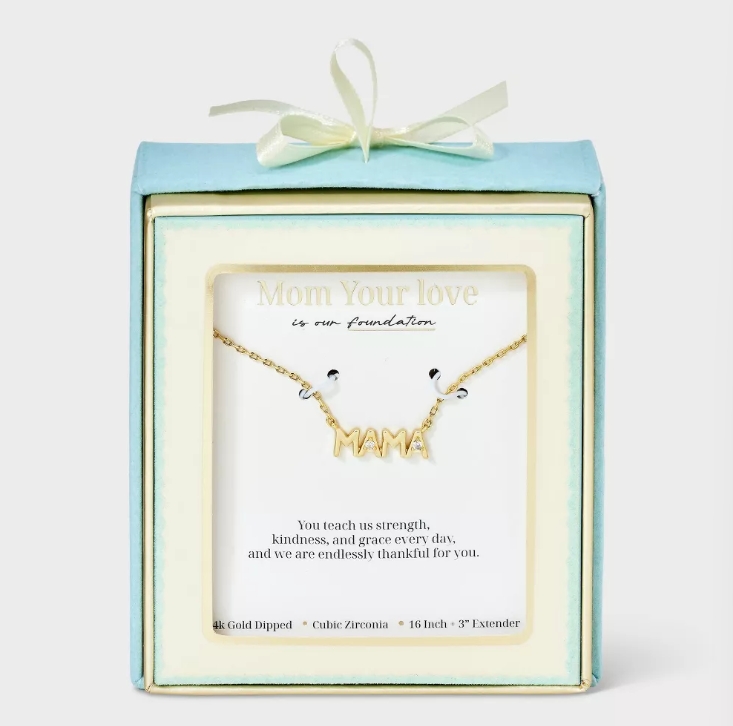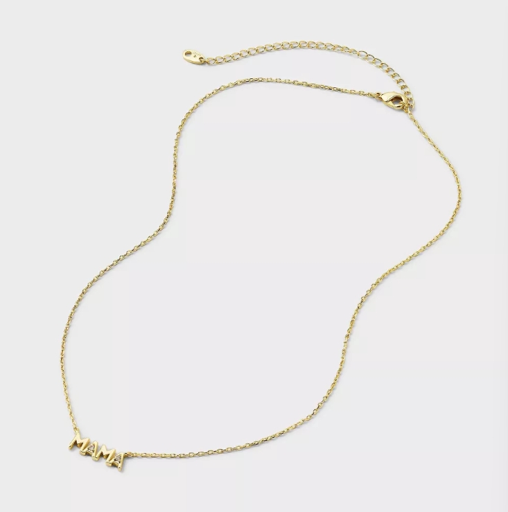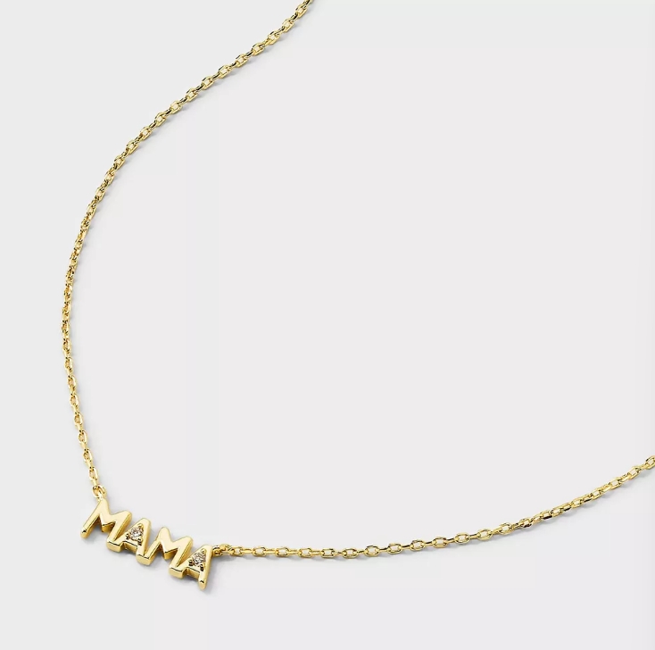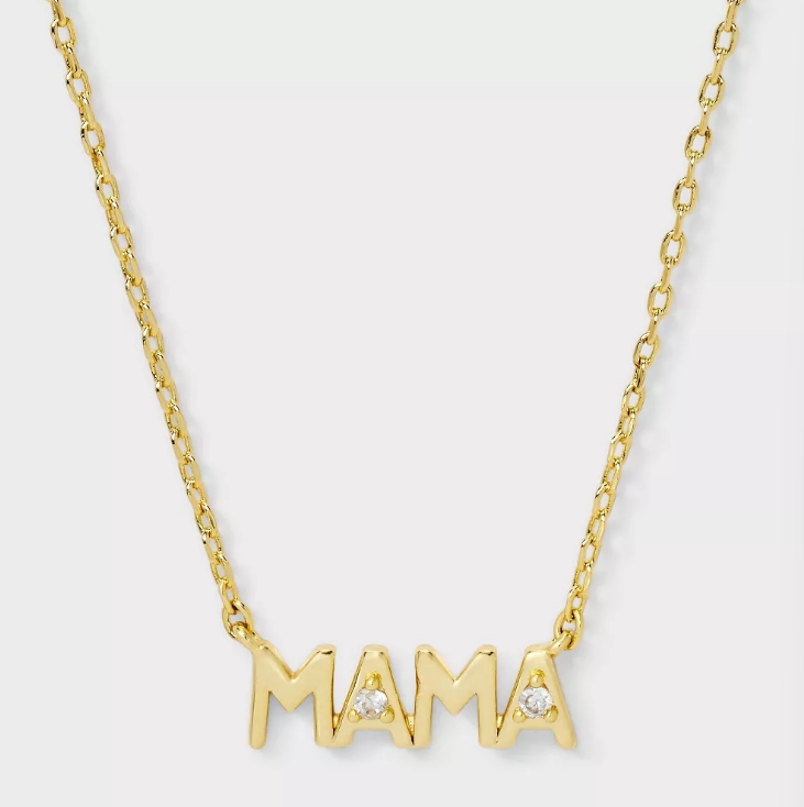 這款項鍊採用手感圓潤的 MAMA 字母設計,並在字母間鑲嵌精緻鋯石,