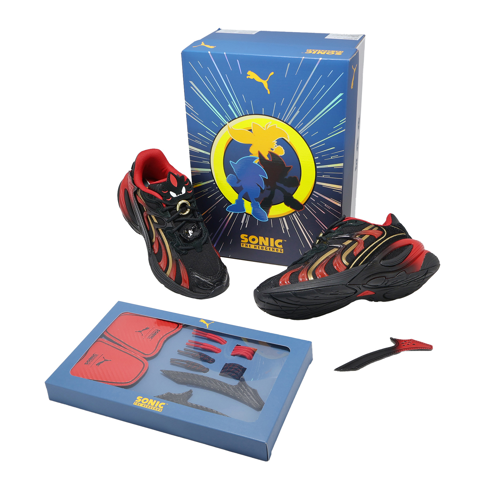 * 鞋舌與鞋身通常帶有 PUMA x SONIC 聯名標誌,部分款式配備可替換的 Formstrip 跑道線條。