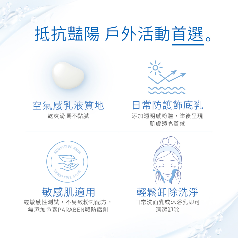 極致水潤,零負擔的舒適使用感,以清爽水感守護肌膚遠離紫外線,可作為飾底乳使用。