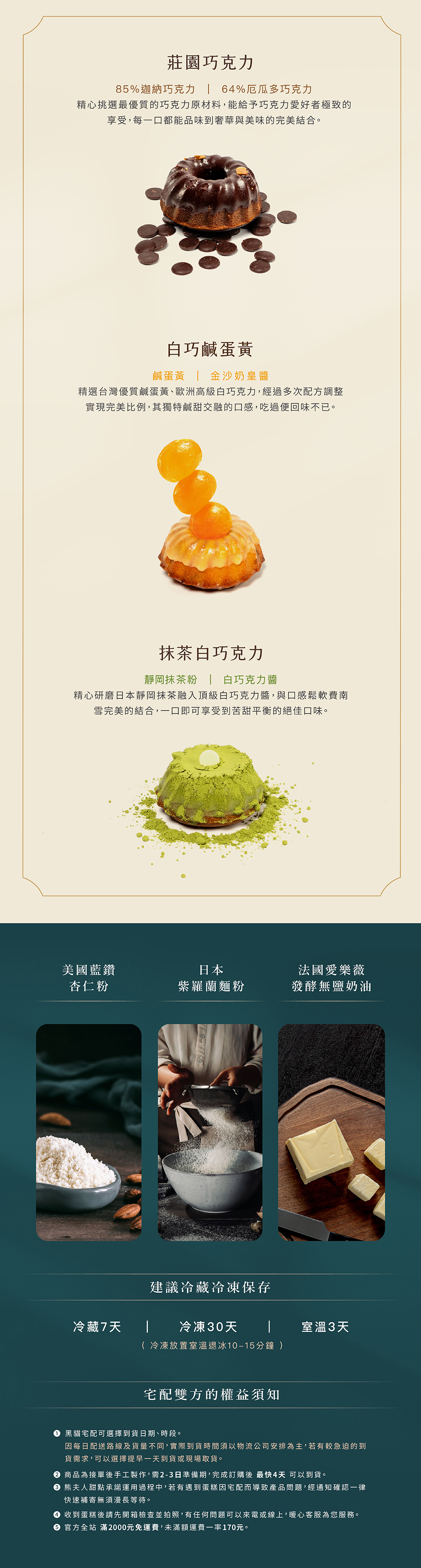 鹹蛋黃白巧克力:精選台灣優質鹹蛋黃、歐洲高級白巧克力,經過多次配方調整實現完美比例,其獨特鹹甜的交融口感,吃過便回味不已。