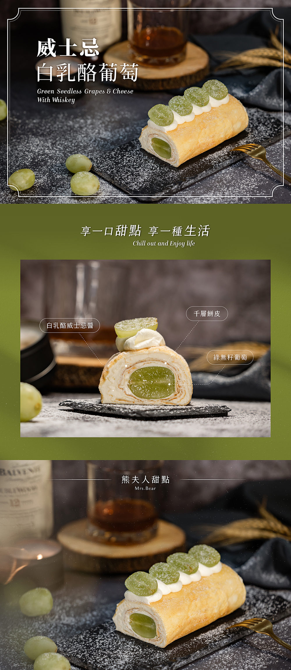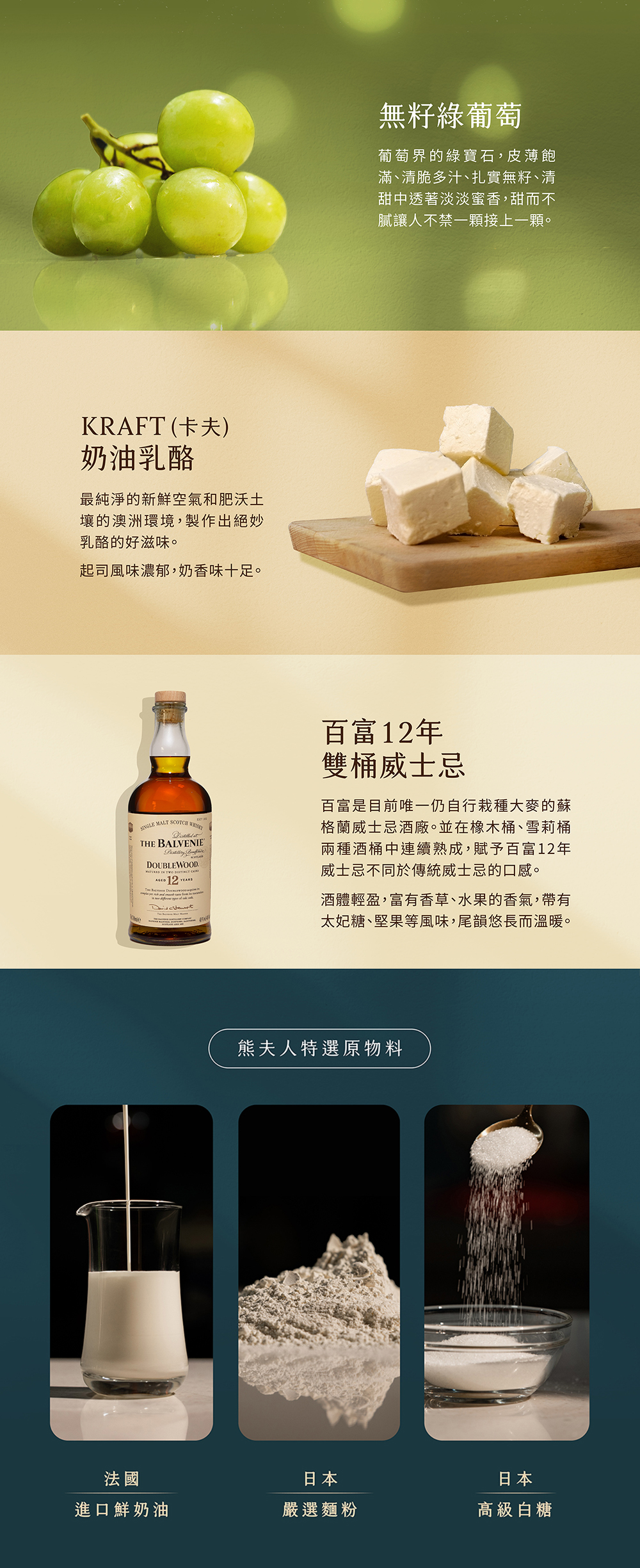 原料:綠葡萄、百富12年雙桶威士忌、奶油乳酪、鮮奶油、千層餅皮尺寸:16*8*6(cm)適合:4~6人享用
