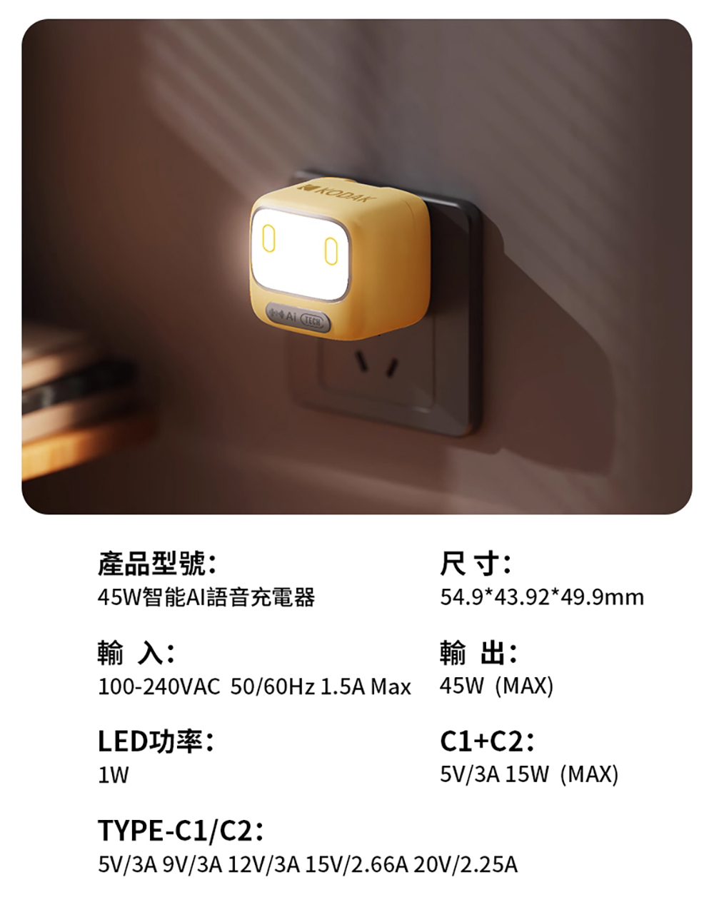 6、TYPE-C1/C2 : 5V/3A 9V/3A 12V/3A 15V/2.66A 20V/2.25A
