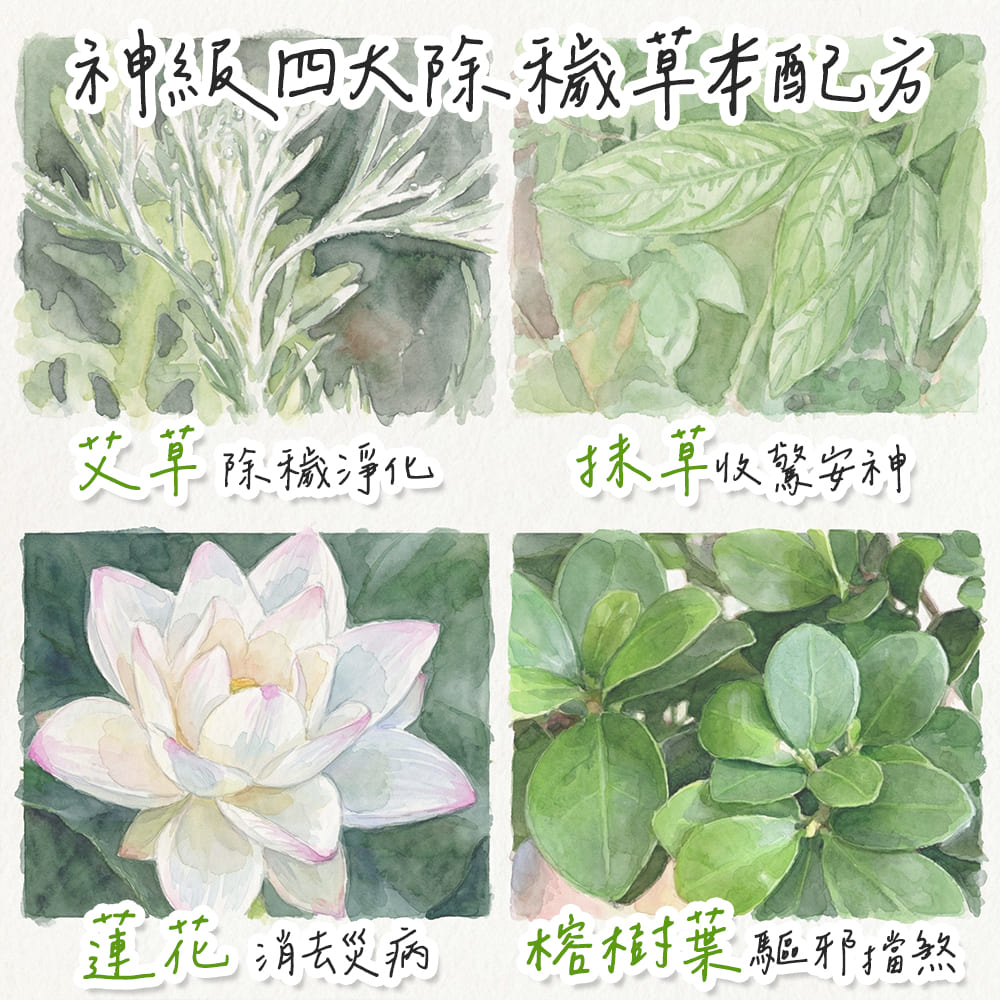 升級配方2◆在原有神級四大除穢草本(艾草/抹草/榕樹葉/蓮花)的基礎上,特別提升「艾草」比例 10%,讓除穢效果更加有感!