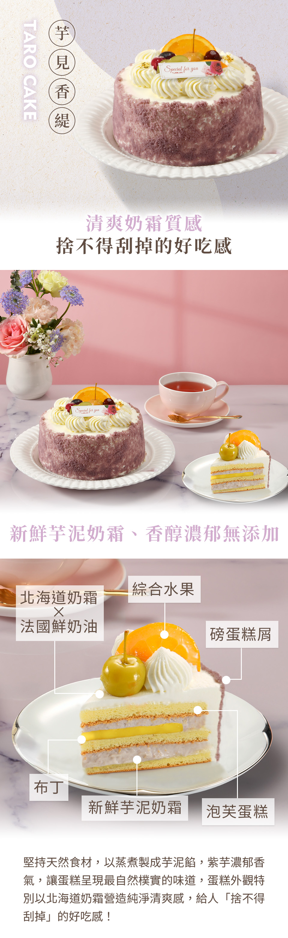 清爽奶霜質感 捨不得刮掉的好吃感堅持天然食材,以蒸煮製成芋泥餡,紫芋濃郁香氣,讓蛋糕呈現最自然樸實的味道,蛋糕外觀特別以北海道奶霜營造純淨清爽感,給人「捨不得刮掉」的好吃感!