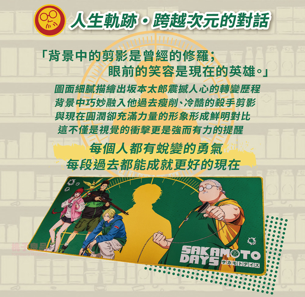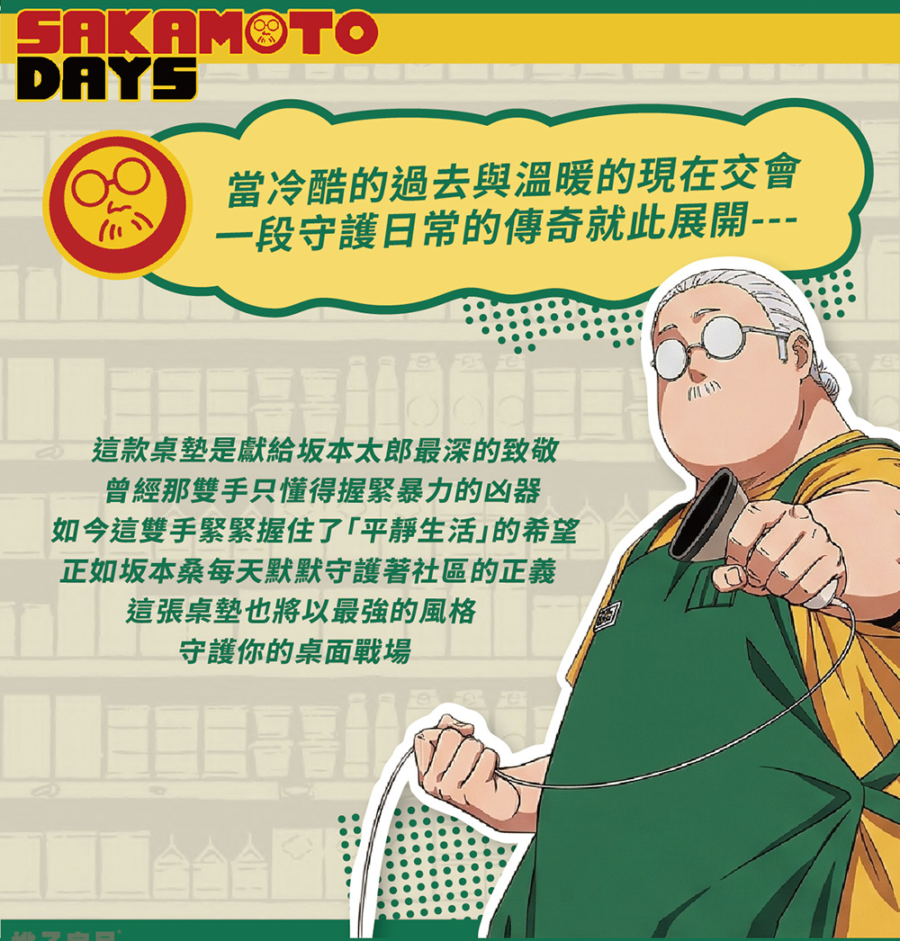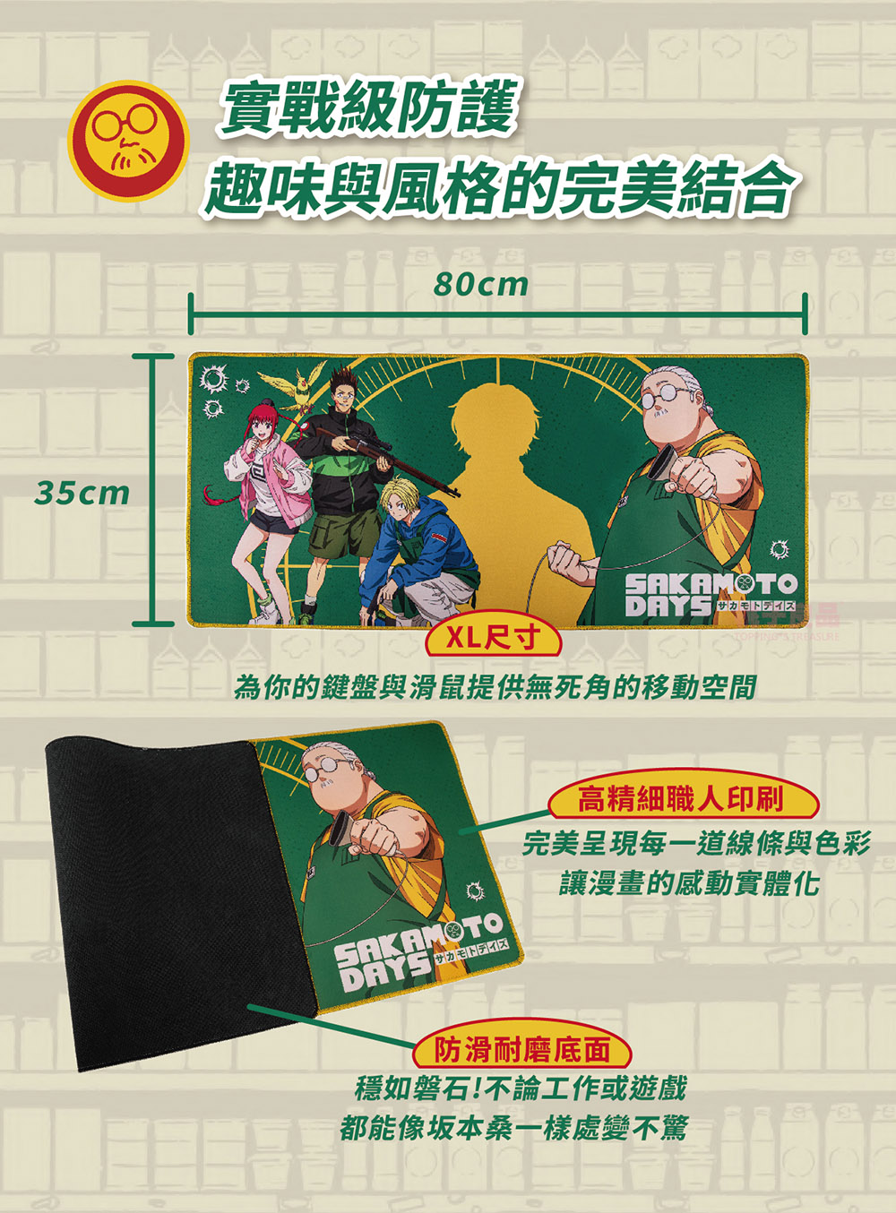【注意事項】 ※ 產品示意圖僅供參考,本賣場不包含主商品以外(如:電腦、手機、票卡...等)之示意配件。 ※ 本賣場產品圖片,可能會因為拍攝角度、環境、螢幕設定、燈光明暗等因素,而產生色差,故請以實際收到貨品為準。 ※ 產品規格之尺寸、重量若為人工測量,測量誤差容許尺寸誤差±2cm/重量誤差±10%g;若為原廠資料,開始銷售後若修改將不另行通知。 【產品規格】 包裝內容物:NetFlix授權【SAKAMOTO DAYS 坂本日常】Sakamoto Sidekick Club XL戰略桌墊 X 1 材 質 :微紋理布料、合成橡膠 重 量 :約 513 g 商品尺寸 :80 x 35 x 0.3cm 產 地 :中國大陸 【產品保固】 保固期限:鑑賞期 保固範圍:新品不良,正常使用造成的外觀磨損不在保固範圍,不當使用造成的故障不在保固範圍。
