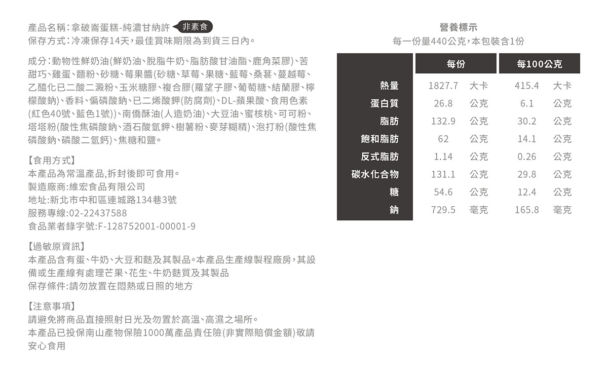 6.原產地(國):台灣7.製造廠商或國內負責廠商名稱:樂天派股份有限公司8.製造廠商或國內負責廠商地址:台北市中山區南京西路1-1號(621室)9.製造廠商或國內負責廠商電話:022511593710.以消費者收受日算起,至少距有效日期前?日以上:最佳賞味3天,冷凍14天11.食品業者登錄字號:A-152464493-00000-512.投保產品責任險字號:1502字第14PD03870號備註欄:無