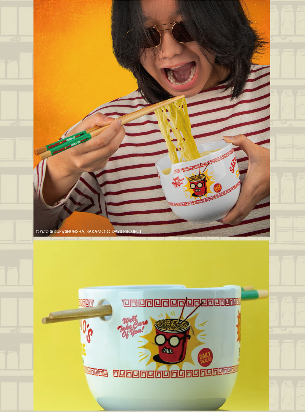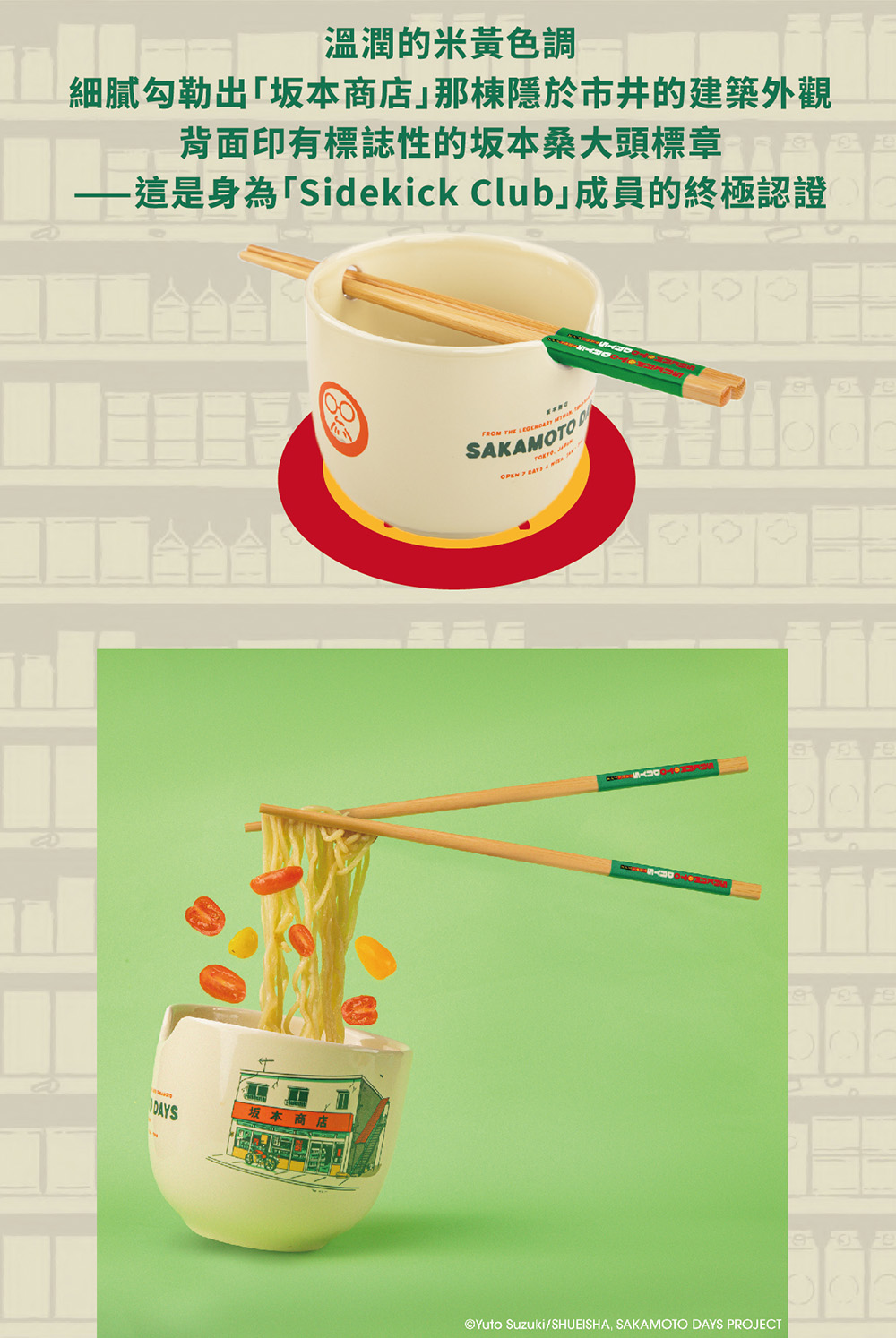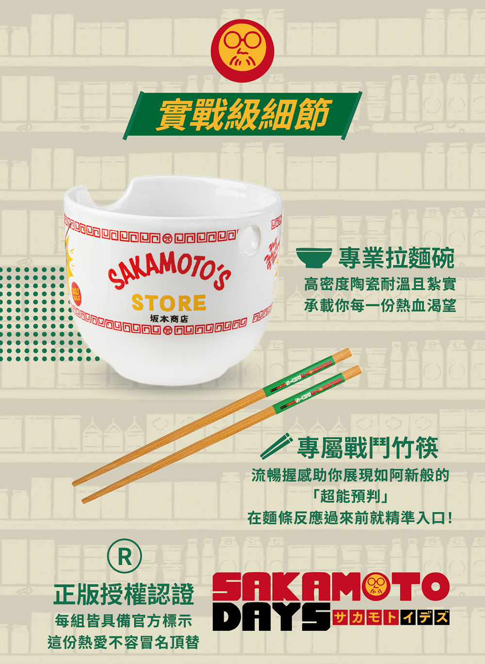 【產品規格】包裝內容物:NetFlix官方授權【SAKAMOTO DAYS 坂本日常】坂本商店開業必備之究極拉麵碗筷組 X 1材 質 :拉麵碗/高密度陶瓷、筷子/天然竹重 量 :約 440g碗身尺寸 :直徑12 x 高10cm產 地 :中國大陸