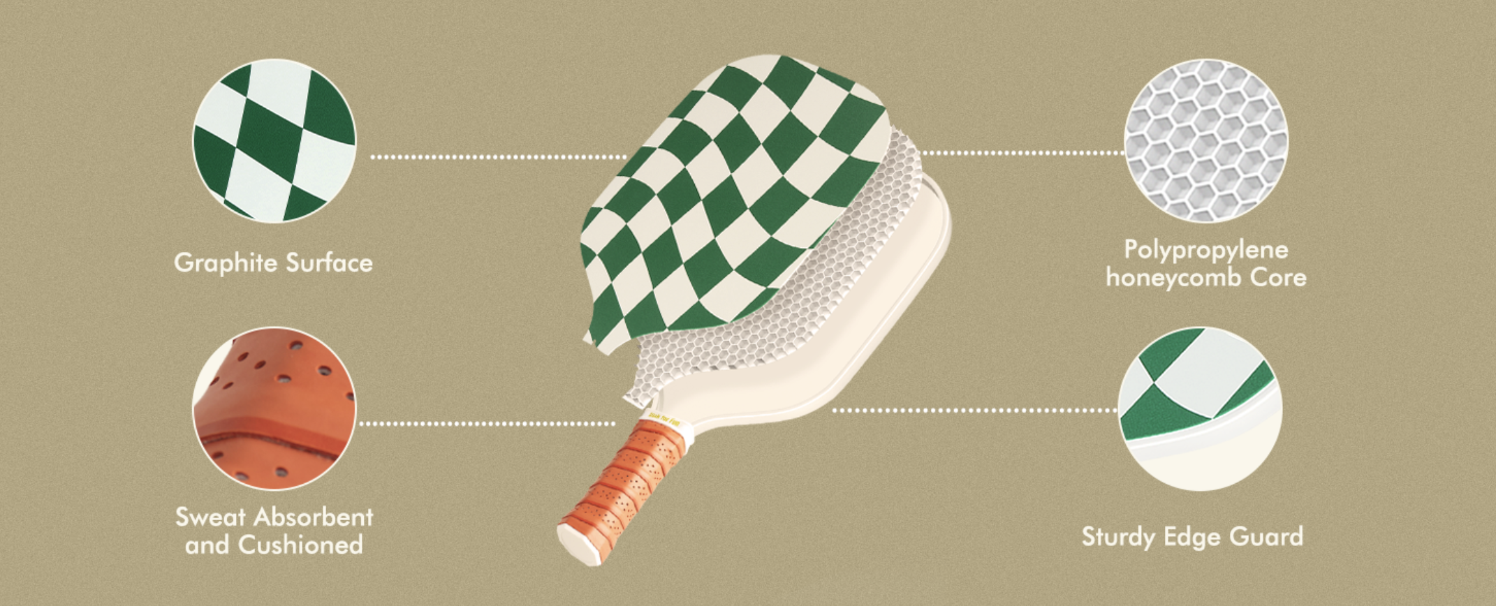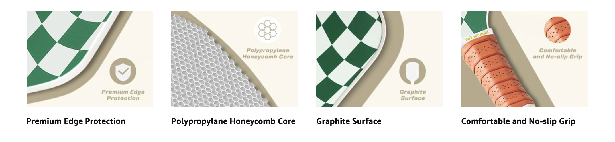 新手友善設計採用約14mm蜂巢結構拍芯,搭配約8.5oz輕量設計,提供良好的擊球面積與平衡手感,適合初學者輕鬆上手。碳纖維表面結合邊框保護設計,提升耐用性與使用穩定度。