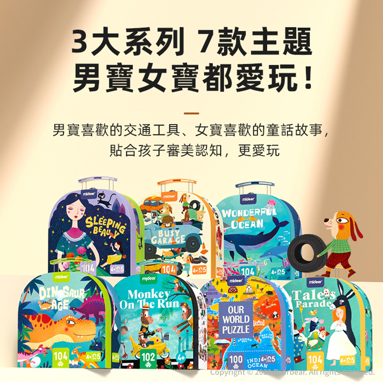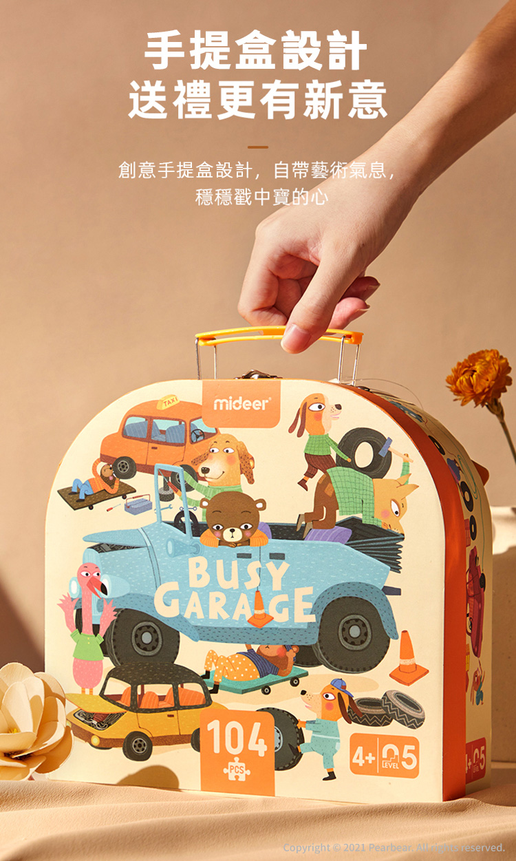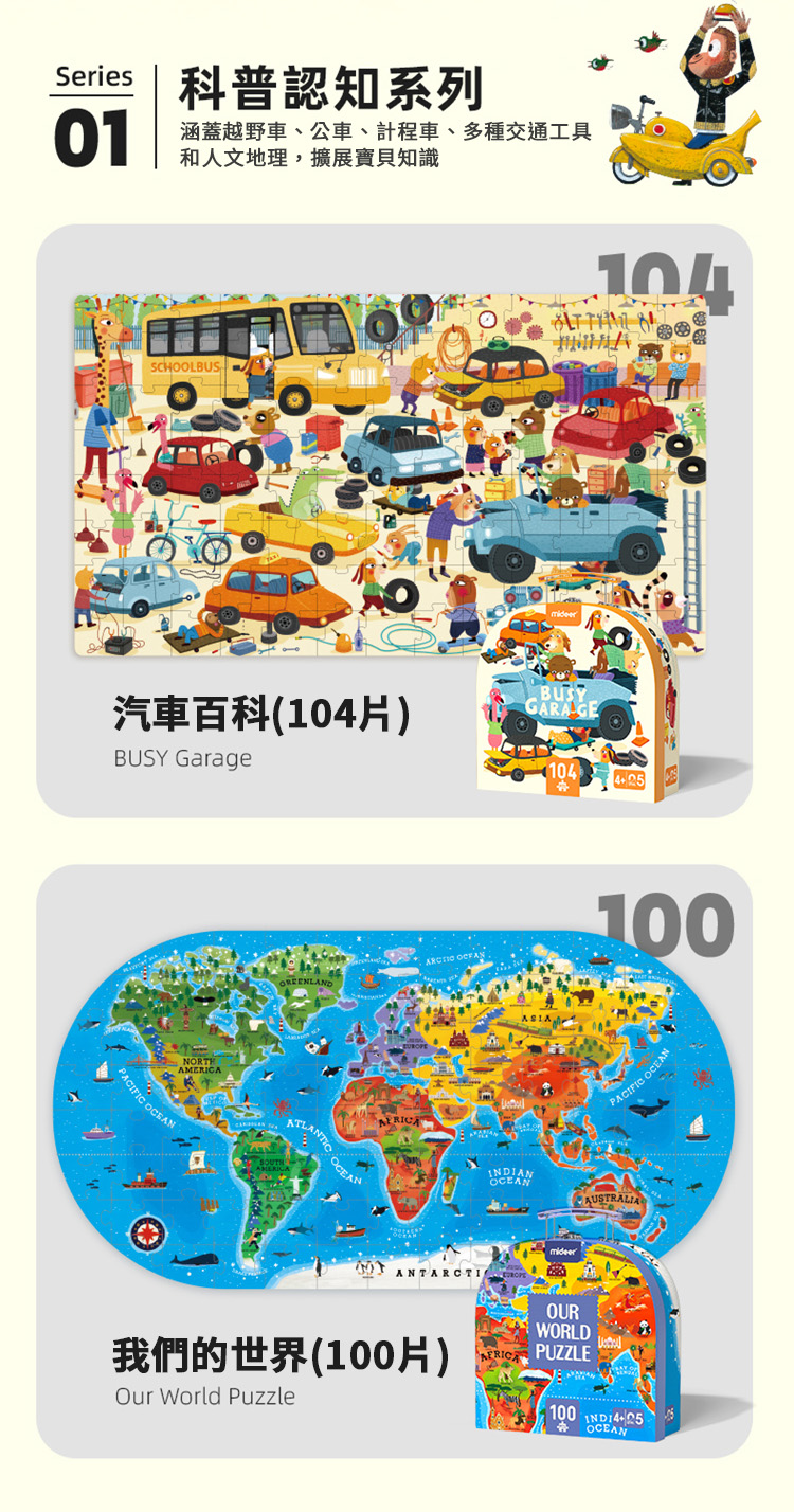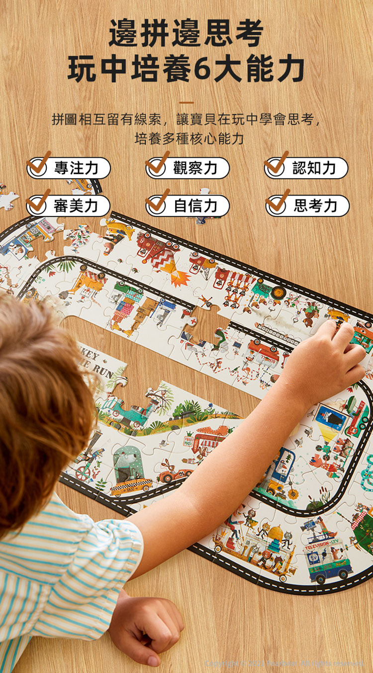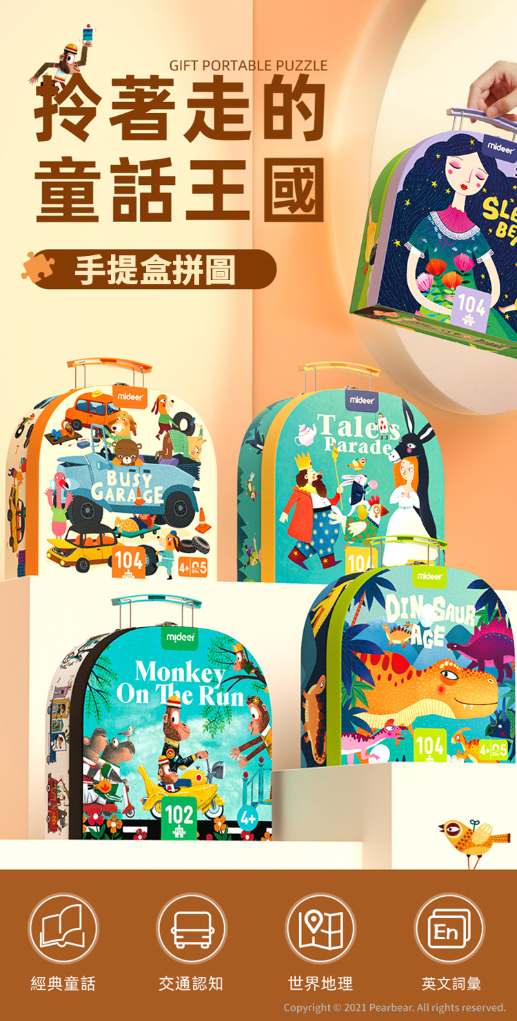 手提盒拼圖系列,主題式拼圖,多彩有趣,多重樂趣妙不可言。包含經典童話、恐龍題材、世界地圖、英文詞彙、汽車主題。精細動作練習,鍛鍊寶寶手腦發育。多達104片拼圖,開啟專注力新挑戰,片數多的拼圖較為複雜,需要孩子集中注意力,完成挑戰。