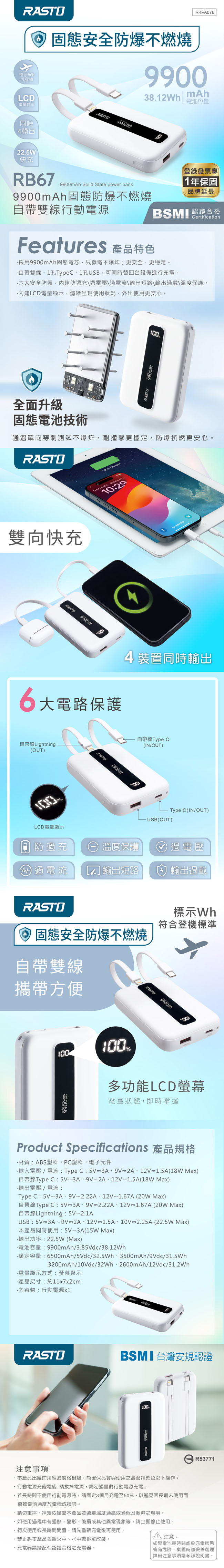 .BSMI證號:R53771 檢詞型號:R-IPA076.固態電池技術,安全防爆、不燃燒,使用更安心.9900mAh 大容量:日常通勤、外出旅遊一次搞定.雙向快充設計:支援快速充電,節省等待時間.自帶雙線(Lightning / Type C),免帶線,隨插即充.多裝置同時輸出,最多可 4 裝置同步充電.22.5W 高效輸出,支援多種快充規格.LCD 電量顯示,即時掌握剩餘電量.6 大電路保護:過充、過放、過流、過壓、過溫、短路全面防護.輕巧好攜帶,外出、商務、旅遊皆適合