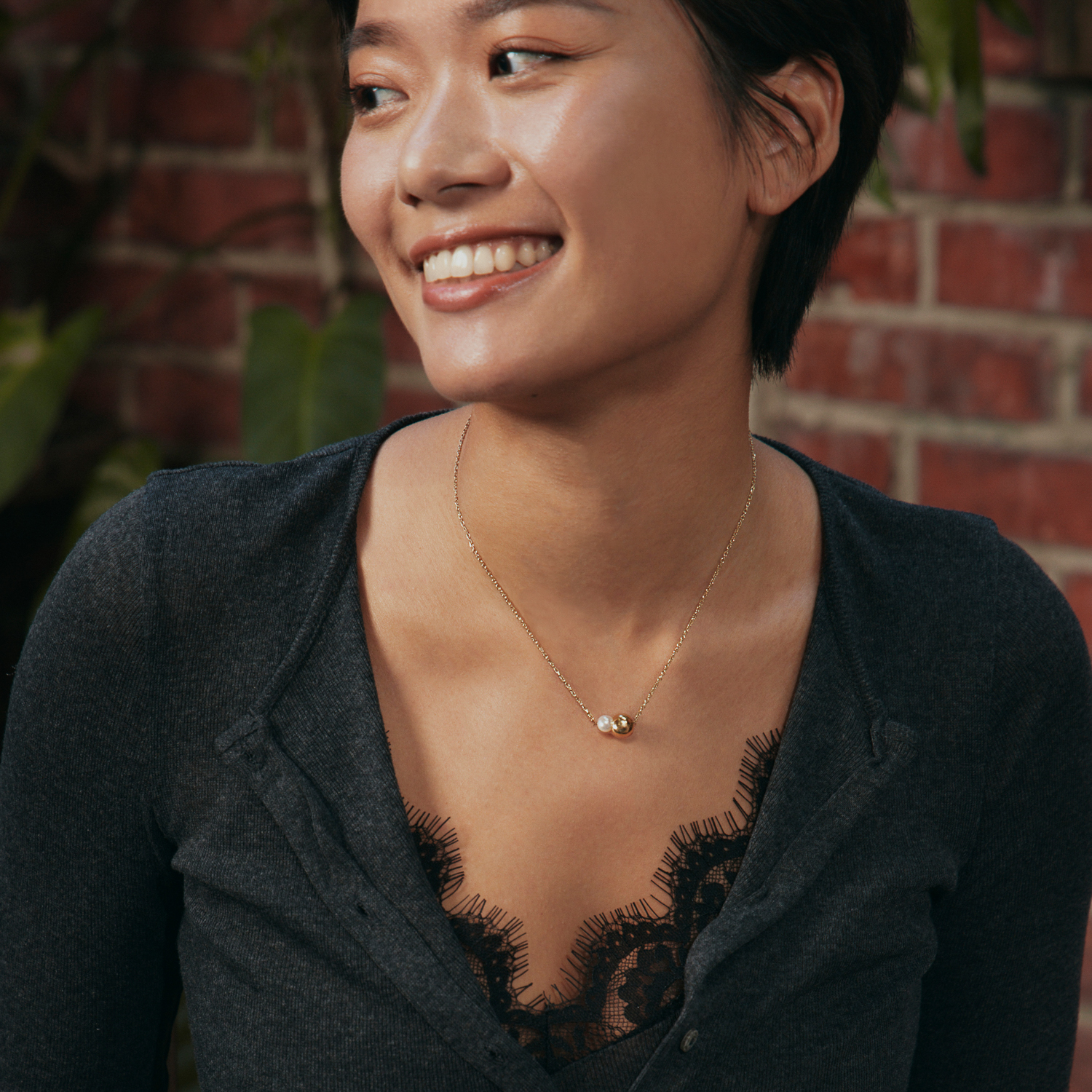 項鍊墜飾輕微偏移的穿孔,讓珍珠與金屬球在配戴時,產生自然流動的垂墜感——象徵關係中「保留給彼此相互的自由空間」。