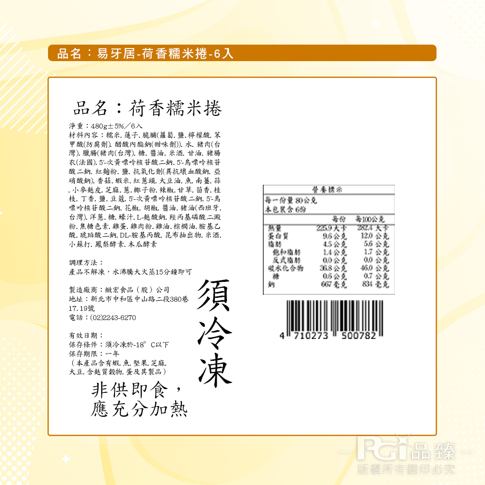 1.商品組合/規格:【易牙居】荷香糯米捲(6顆/盒)2.商品品名:【易牙居】荷香糯米捲(6顆/盒)3.內容成分:(依商品說明圖片標示)※本產品含有蝦、魚、堅果、芝麻、大豆、含麩質穀物、蛋及其製品。4.商品重(容)量:80g/顆;480g±5%5.原產地(國):台灣6.保存期限:-18℃以下冷凍 1年(實際依商品包裝標示)7.製造廠商或國內負責廠商名稱:品臻國際行銷有限公司8.製造廠商或國內負責廠商地址:台北市中山區民生東路一段43號7樓9.製造廠商或國內負責廠商電話:02-8861-520810.食品業者登錄字號:A-127757268-00000-211.投保產品責任險字號:富邦產物0510字第26AML0000235號