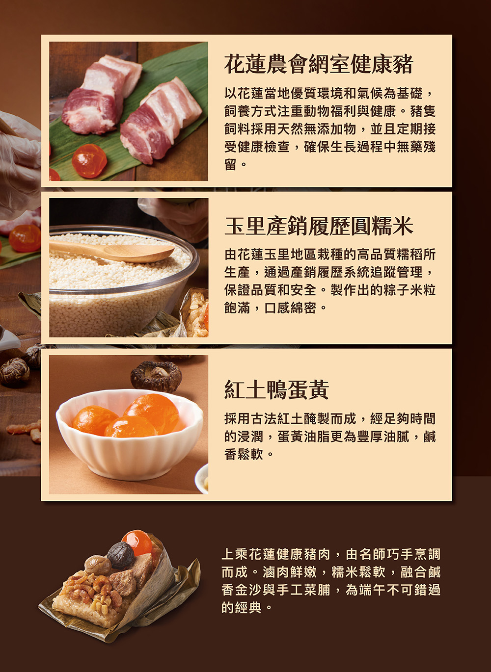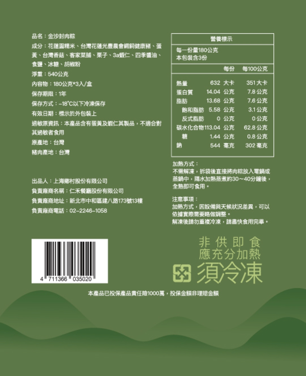 1.商品組合/規格:【上海鄉村】金沙封肉粽禮盒(3顆/盒)2.商品品名:【上海鄉村】金沙封肉粽禮盒(3顆/盒)3.成分:(依商品說明圖片標示)※本產品含有蛋黃及蝦仁其製品,不適合對其過敏者食用。4.商品重(容)量:540g5.原產地(國):台灣6.保存期限:-18℃以下冷凍 1年(實際依商品包裝標示)7.製造廠商或國內負責廠商名稱:品臻國際行銷有限公司8.製造廠商或國內負責廠商地址:台北市中山區民生東路一段43號7樓9.製造廠商或國內負責廠商電話:02-8861-520810.食品業者登錄字號:A-127757268-00000-211.投保產品責任險字號:富邦產物0510字第26AML0000235號