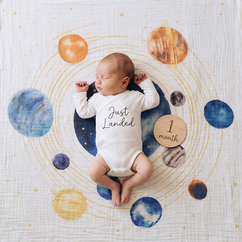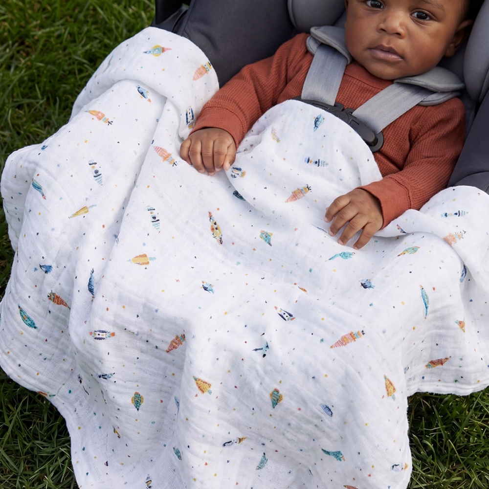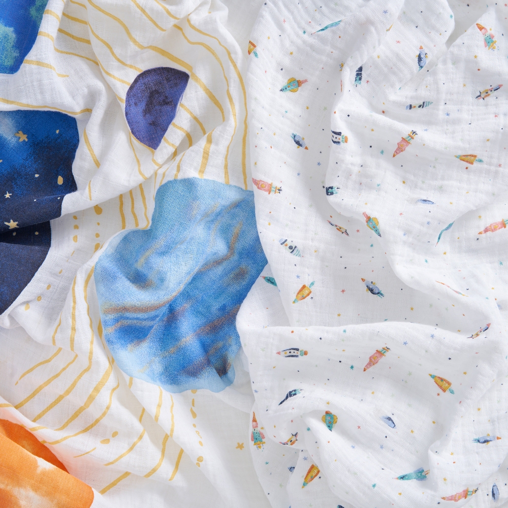 只想給寶寶最貼心的柔軟呵護! • 夢幻的行星和星空點綴著太空人,色調清新可愛,帶來遨遊太空的趣味想像。• 通過GOTS有機棉認證,不使用農藥和化學肥料栽種,有助於減少對環境的負面影響,同時也符合環保需求。• 採用100% GOTS認證有機棉紗布,柔軟舒適、透氣、保暖,並且無毒、無化學藥劑,非常適合敏感肌以及異膚的寶寶使用。• 運用開放的稀鬆編織法,減少嬰兒過熱窒息的風險。 • 一巾多用,包巾不僅能當哺乳巾也能作為嬰兒蓋毯以及推車遮陽巾,更可以當作居家的床單以及枕頭套,多種用途超方便。• 套洗衣袋機洗,吊掛晾曬快乾,輕鬆維持衛生。