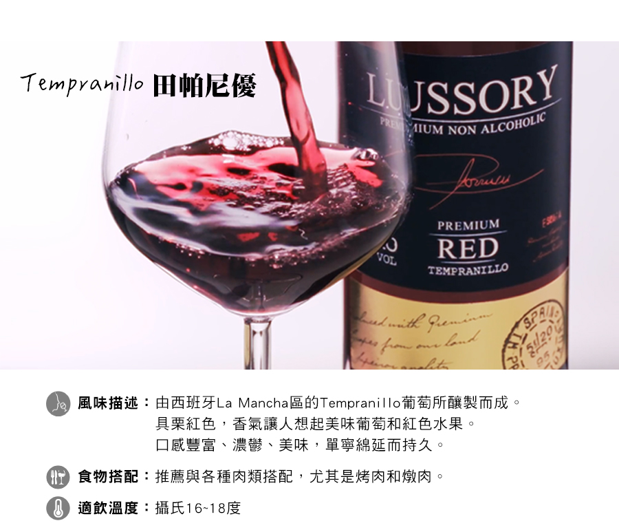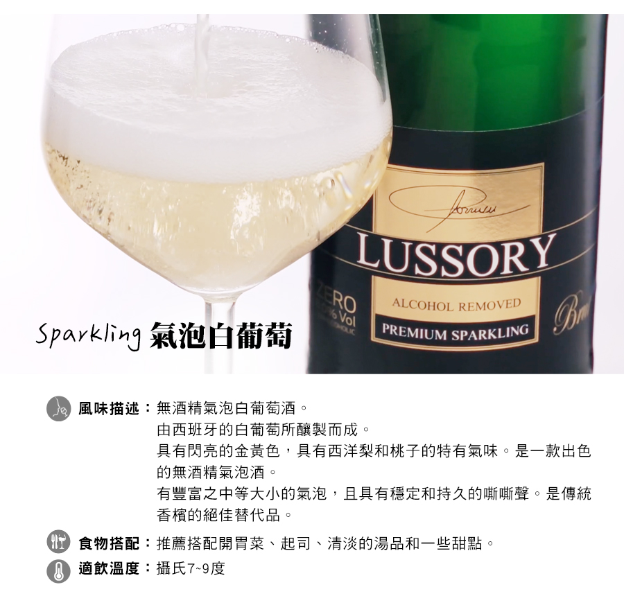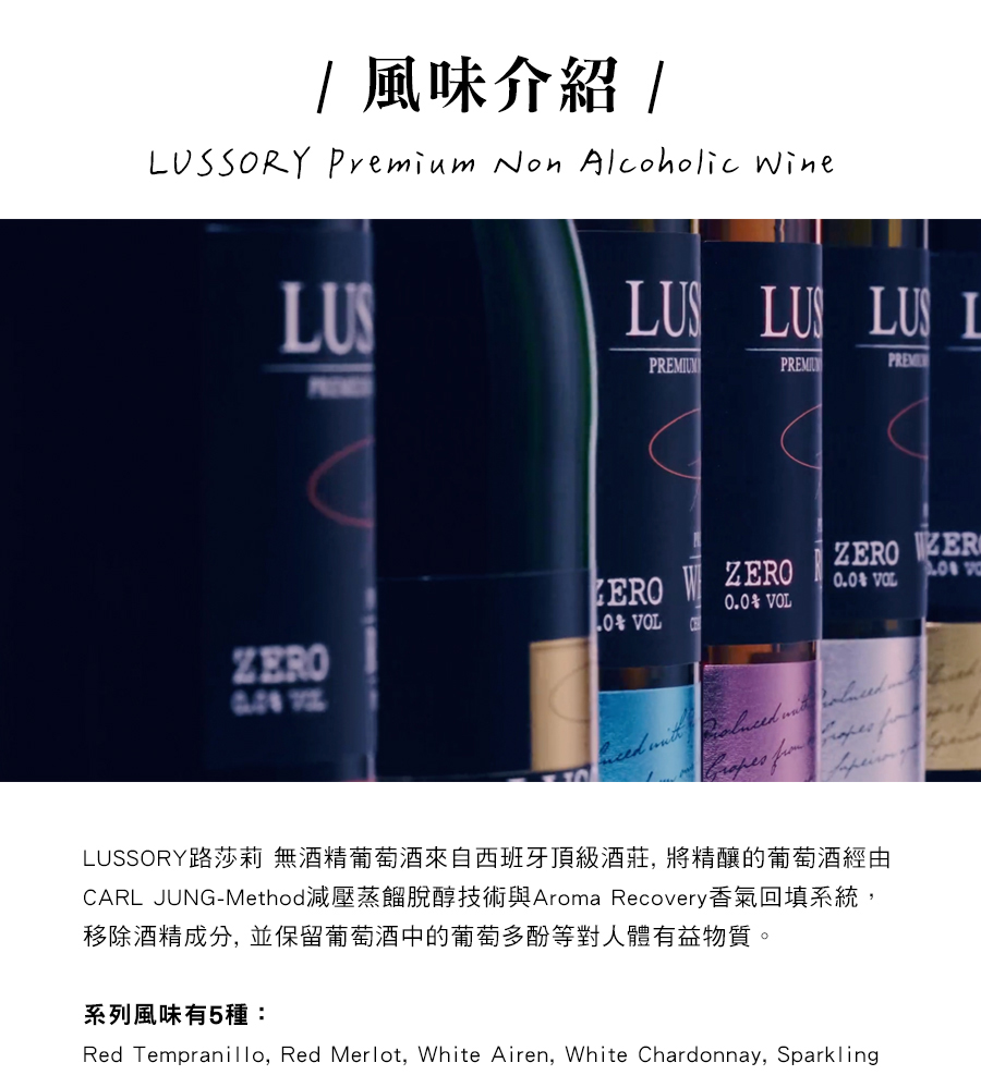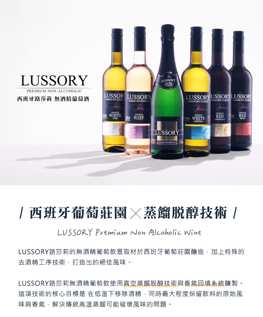LUSSORY路莎莉的無酒精葡萄飲是取材於西班牙葡萄莊園釀造,加上特殊的去酒精工序技術,打造出的絕佳風味。目前共有5種不同風味:Tempranillo 田帕尼優, Merlot 梅洛, Airen 阿依倫, Chardonnay 夏多內, Sparkling 氣泡白葡萄