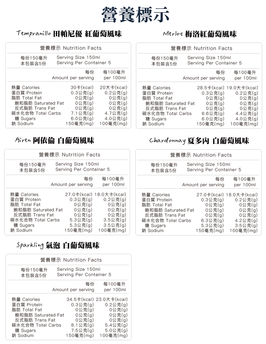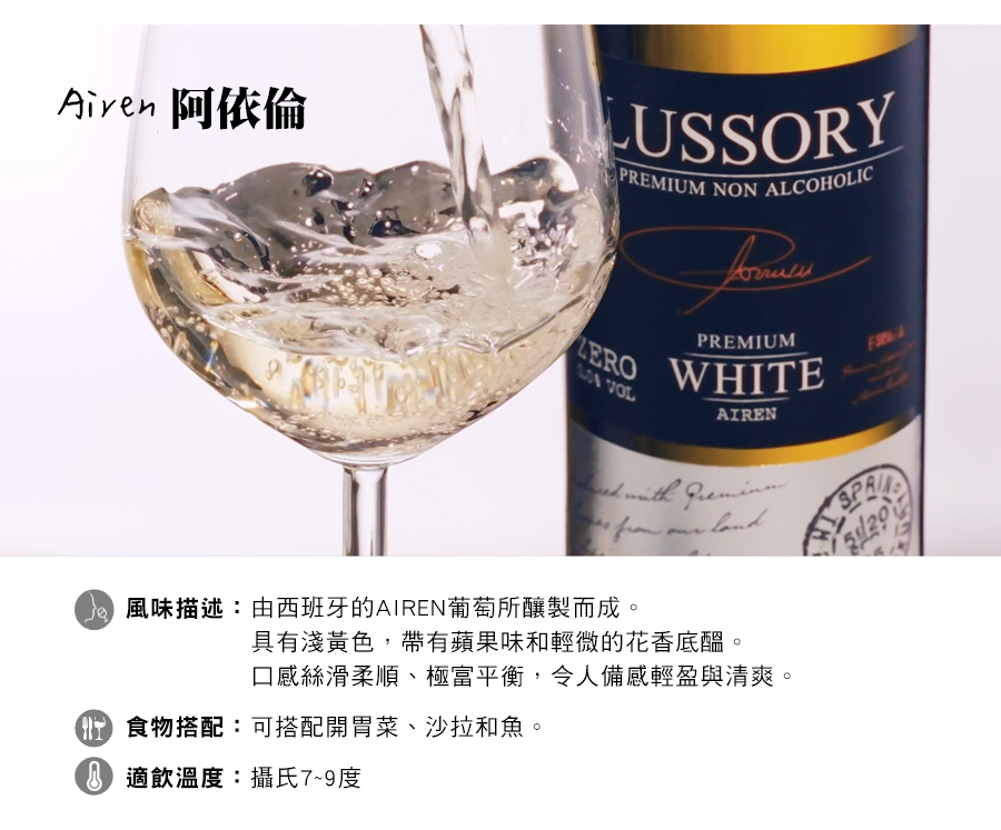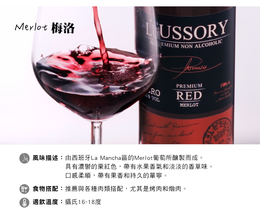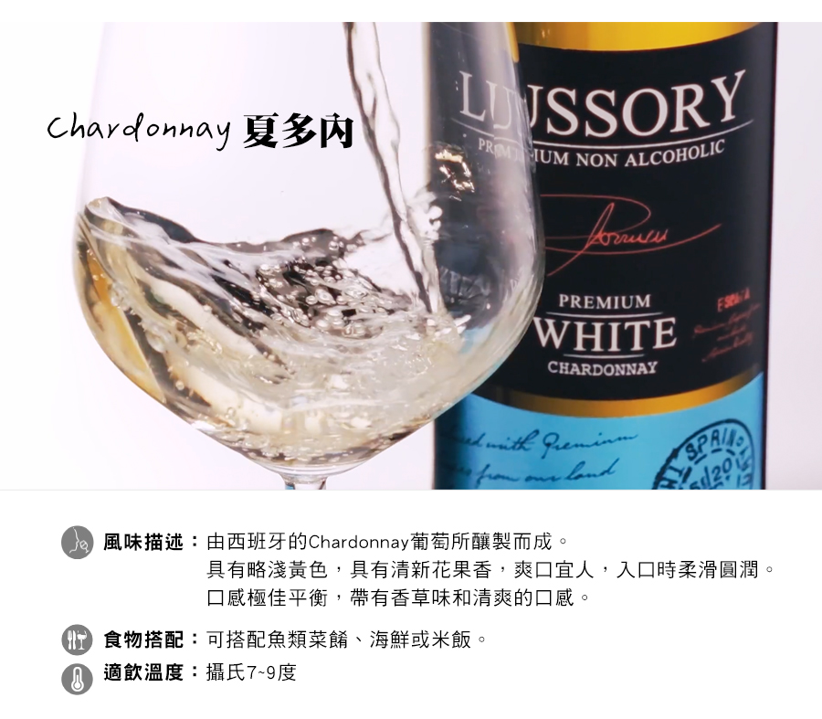 LUSSORY路莎莉的無酒精葡萄飲是取材於西班牙葡萄莊園釀造,加上特殊的去酒精工序技術,打造出的絕佳風味。目前共有5種不同風味:Tempranillo 田帕尼優, Merlot 梅洛, Airen 阿依倫, Chardonnay 夏多內, Sparkling 氣泡白葡萄