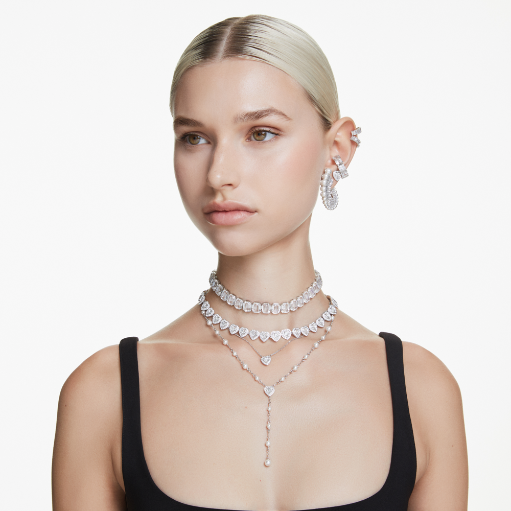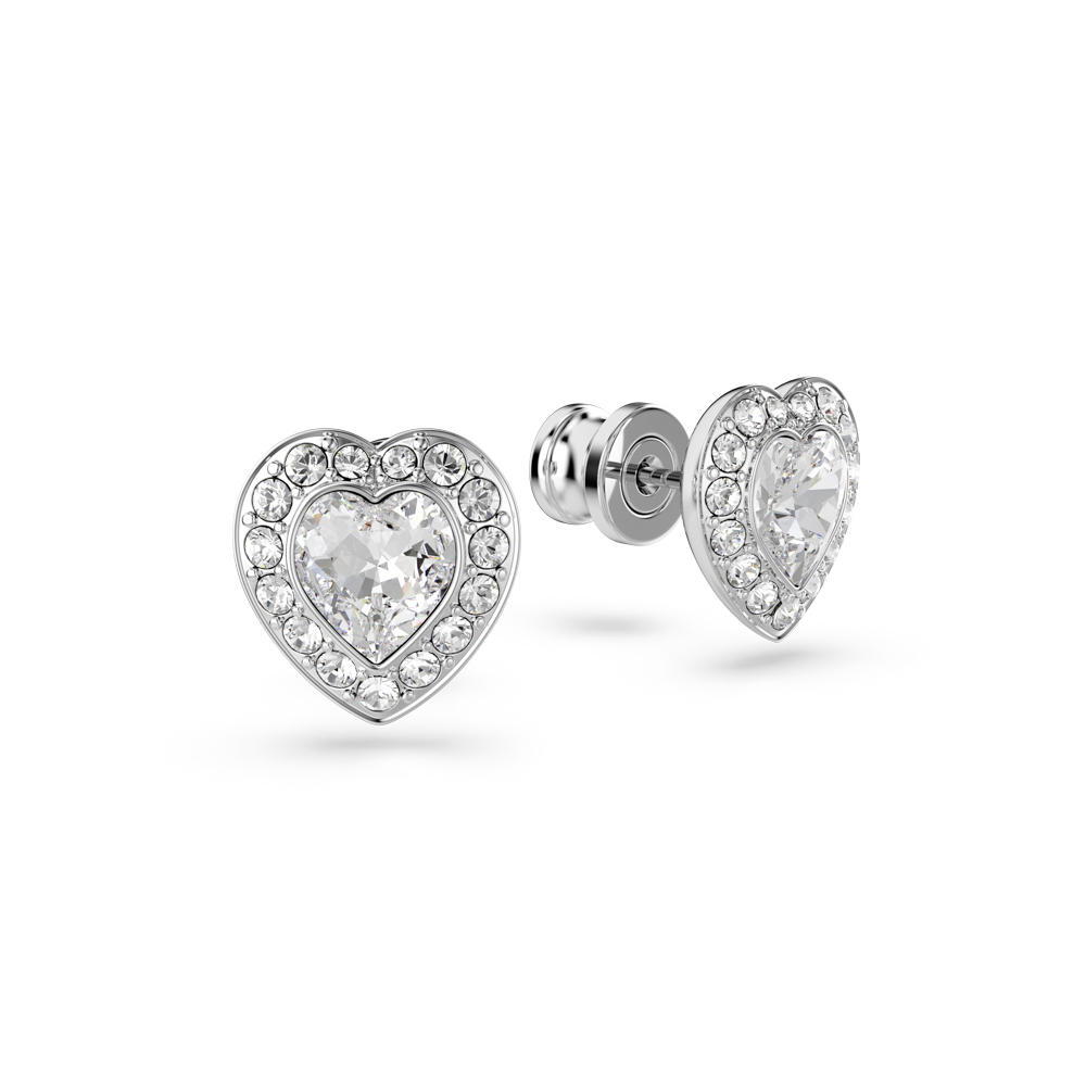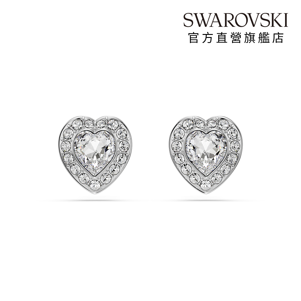 這對歡樂的 Swarovski 穿式耳釘,將兩顆心合而為一。每只鍍銠耳釘均飾有一顆心形 Swarovski 水晶,周圍環繞著閃爍的透明密鑲光環。搭配成套鏈墜,可作為充滿愛意的耀眼禮物。