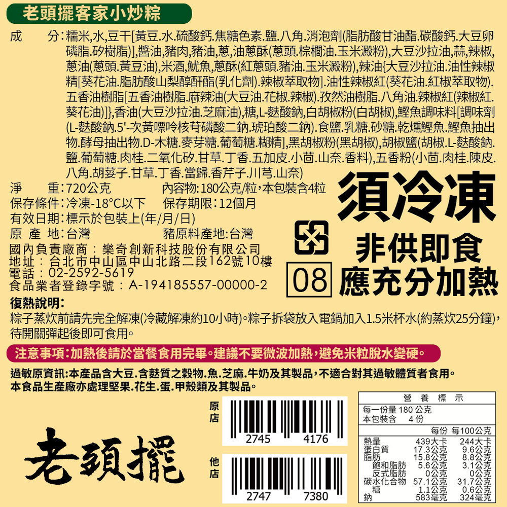4.商品重(容)量:720g(客家小炒粽180g*4顆)/袋5.原產地(國):台灣