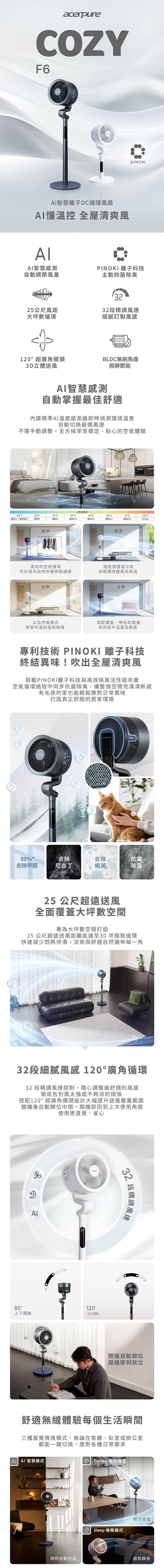 產品名稱: Acerpure COZY F6 AI智慧離子DC循環風扇型號: AF776-20G顏色: 鈦空灰尺寸 (WxDxH):立扇:35 x 35 x 120 cm矮扇:35 x 35 x 80 cm風扇尺寸: 9吋風量調整: 32 段最大送風距離: 25 公尺適用坪數: 約 30 坪擺動模式: 上下:85° (自動) 左右:60° & 120° (自動)模式: AI智慧模式 / Sleep睡眠模式 / Turbo 極強模式離子: 專利 PINOKI 超氧嵌合離子科技定時功能: 開/關 0-12 小時運轉音量 (最小/最大): 30dB / 65dB操控與配件面板: LED 觸控式面板 / LED 顯示螢幕安全功能: 兒童鎖 (V)配件:高度調節柱 / 活性碳夾層 / 磁吸式遙控器 / 電源線 / 說明書 / 保證卡馬達: BLDC 直流馬達額定電壓: 100-240V / 50Hz-60Hz額定功率: 36W淨重: 6.7 公斤包裝重量: 9.2 公斤包裝尺寸 (WxDxH): 32 x 37 x 81 cmBSMI:R3D814