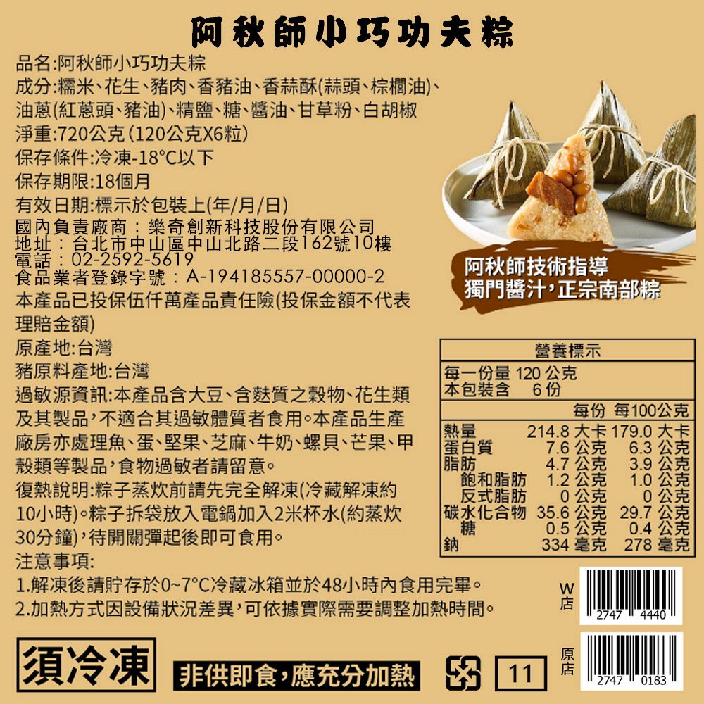1.商品組合/規格:【阿秋師】小巧功夫粽(6入/袋) x2袋2.商品品名:【阿秋師】小巧功夫粽(6入/袋) x2袋3.內容成分:糯米、花生、豬肉、香豬油、香蒜酥(蒜頭、棕櫚油)、油蔥(紅蔥頭、豬油)、精鹽、糖、醬油、甘草粉、白胡椒。