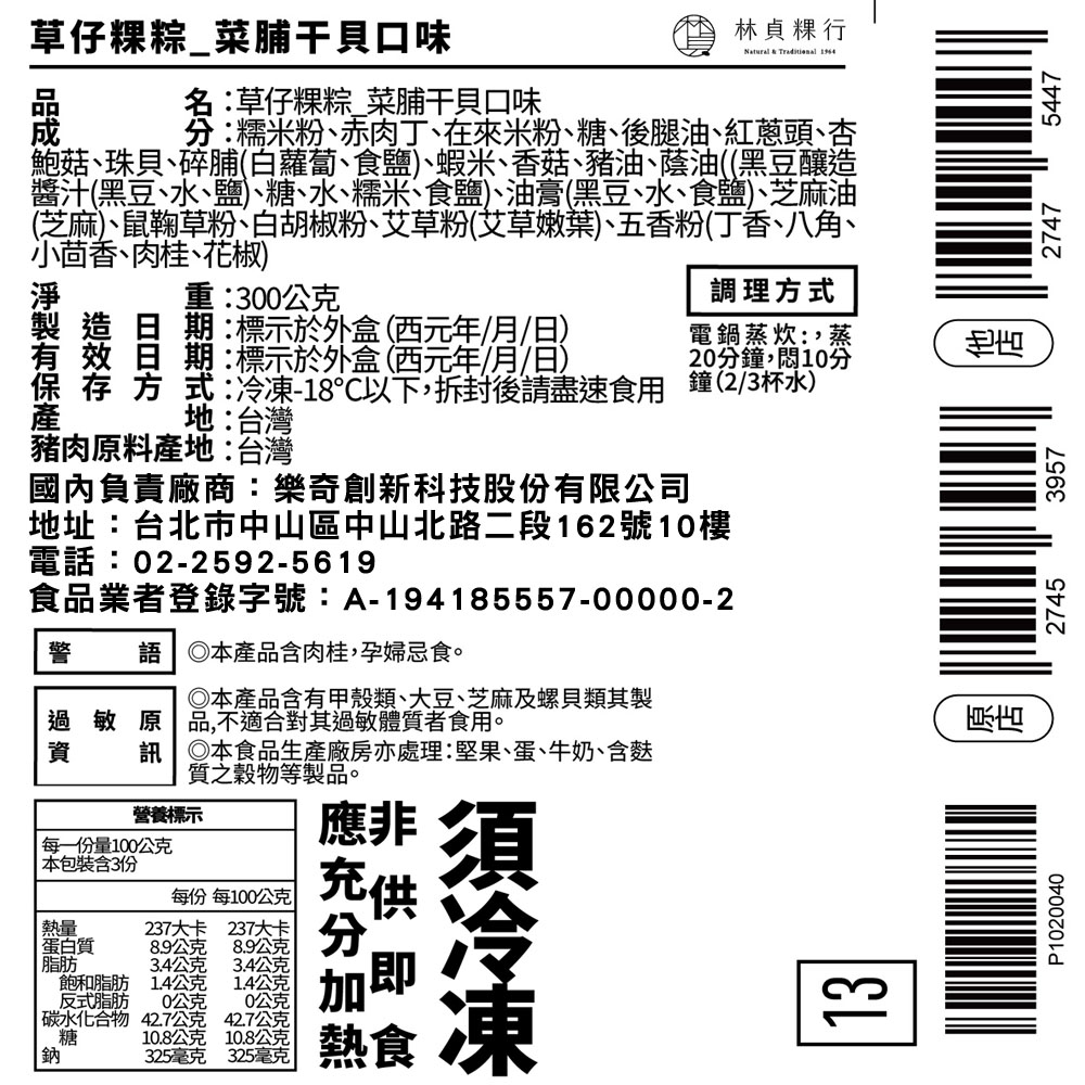 1.商品組合/規格:【林貞粿行】菜脯干貝口味 草仔粿粽禮盒(3入/盒) x2盒2.商品品名:【林貞粿行】菜脯干貝口味 草仔粿粽禮盒(3入/盒) x2盒3.內容成分:糯米粉、赤肉丁、在來米粉、糖、後腿油、紅蔥頭、杏鮑菇、珠貝、碎脯(白蘿蔔、食鹽)、蝦米、香菇、豬油、蔭油((黑豆釀造醬汁(黑豆、水、鹽)、糖、水、糯米、食鹽)、油膏(黑豆、水、食鹽)、芝麻油(芝麻)、鼠鞠草粉、白胡椒粉、艾草粉(艾草嫩葉)、五香粉(丁香、八角、小茴香、肉桂、花椒)。