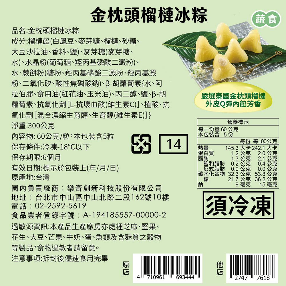 4.商品重(容)量:300g(榴槤冰粽60g*5顆)/袋5.原產地(國):台灣