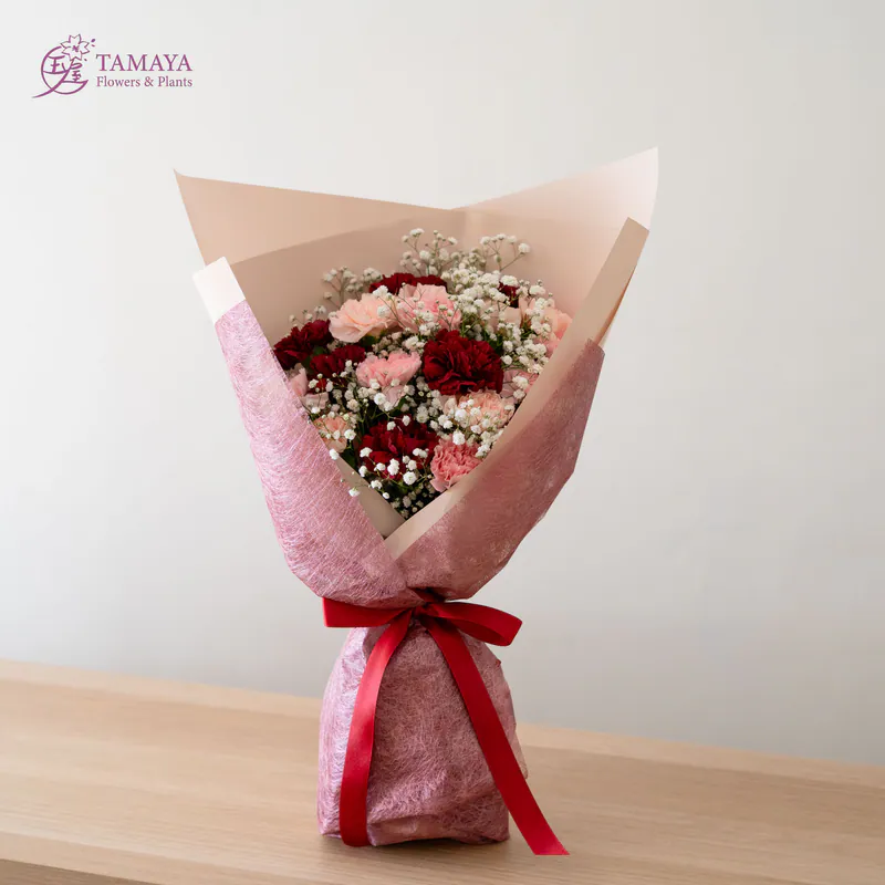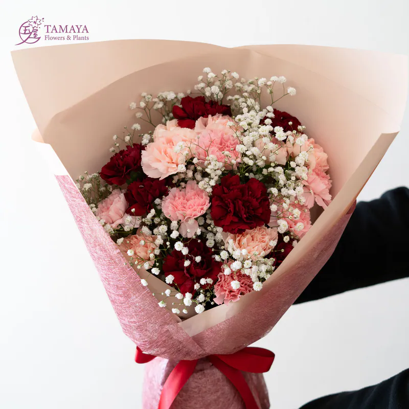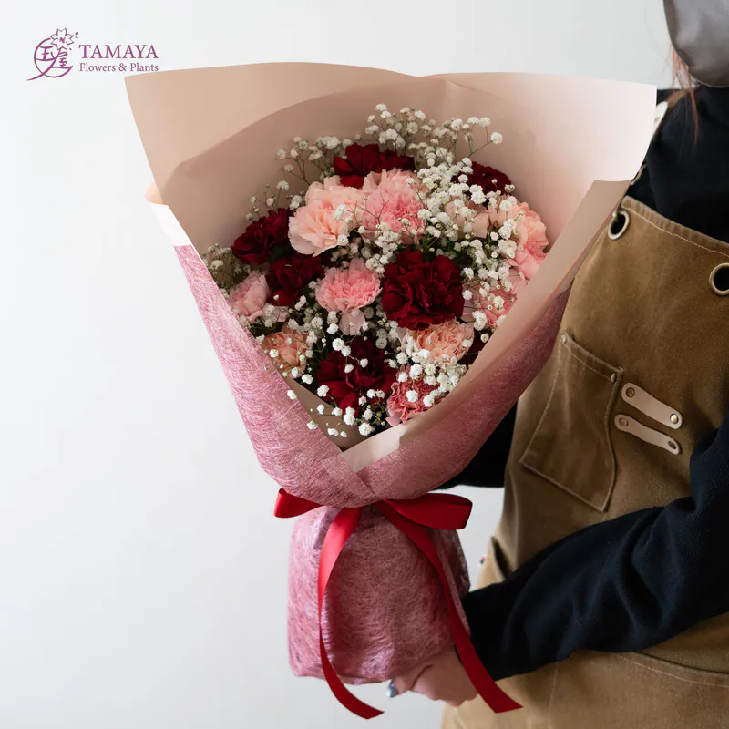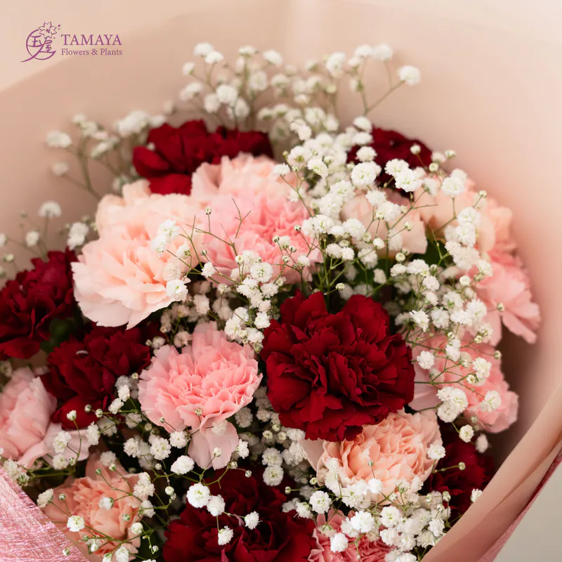 使用三種顏色康乃馨,搭配滿天星的經典花禮,