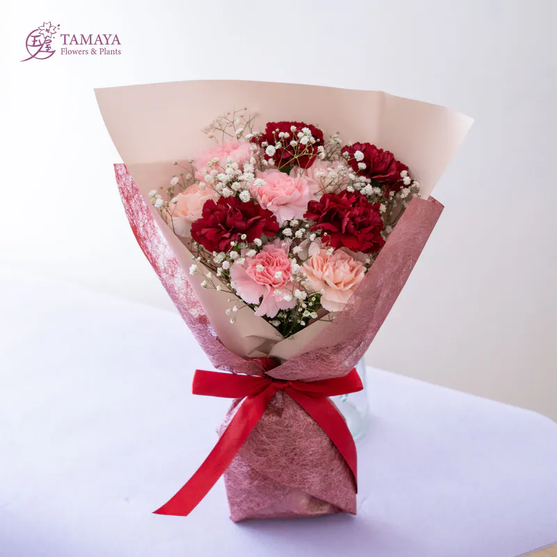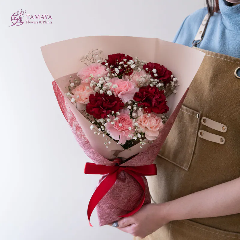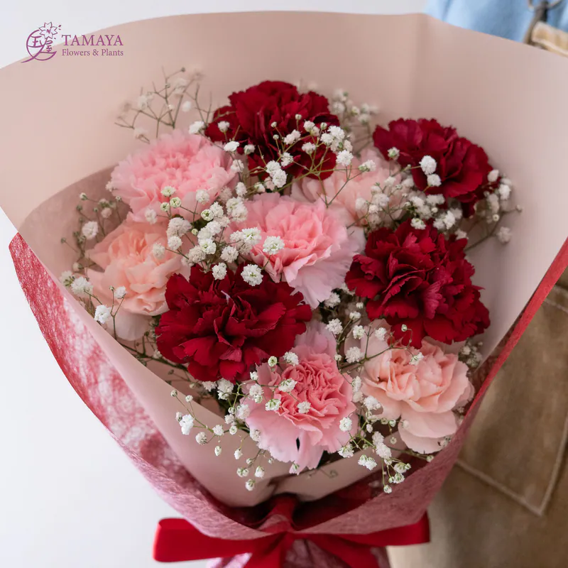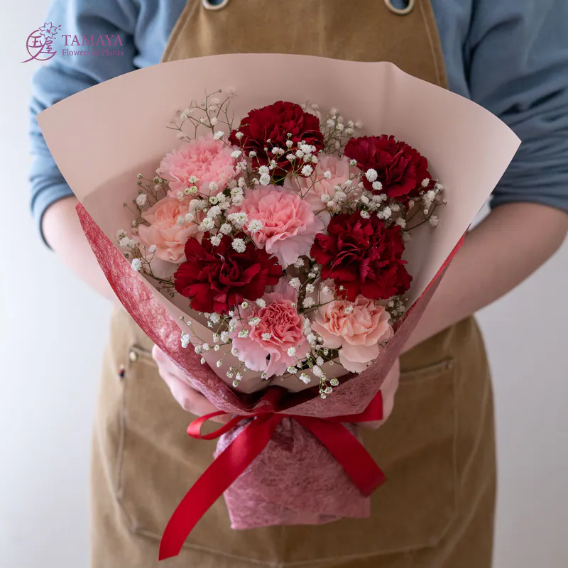 使用三種顏色康乃馨,搭配滿天星的經典花禮,