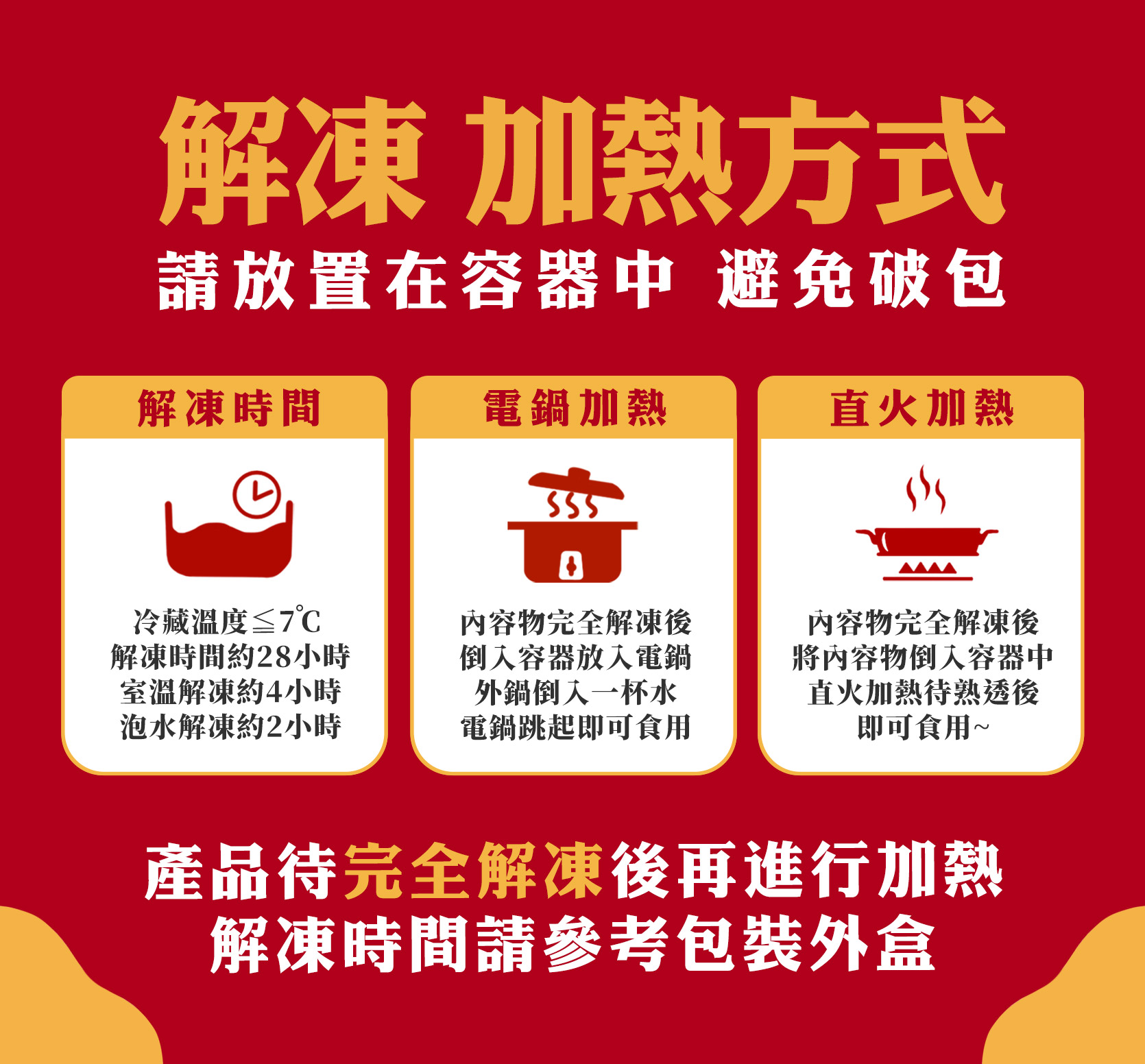 退(換)貨商品須全新不拆封且保存良好,若非檢查之必要或可歸責您的事由,若導致商品損壞包含冷凍食品未保存良善而造成食材毀損,或商品、包裝不完整,或逾退貨期限(到貨7日內),恕無法接受退換貨。