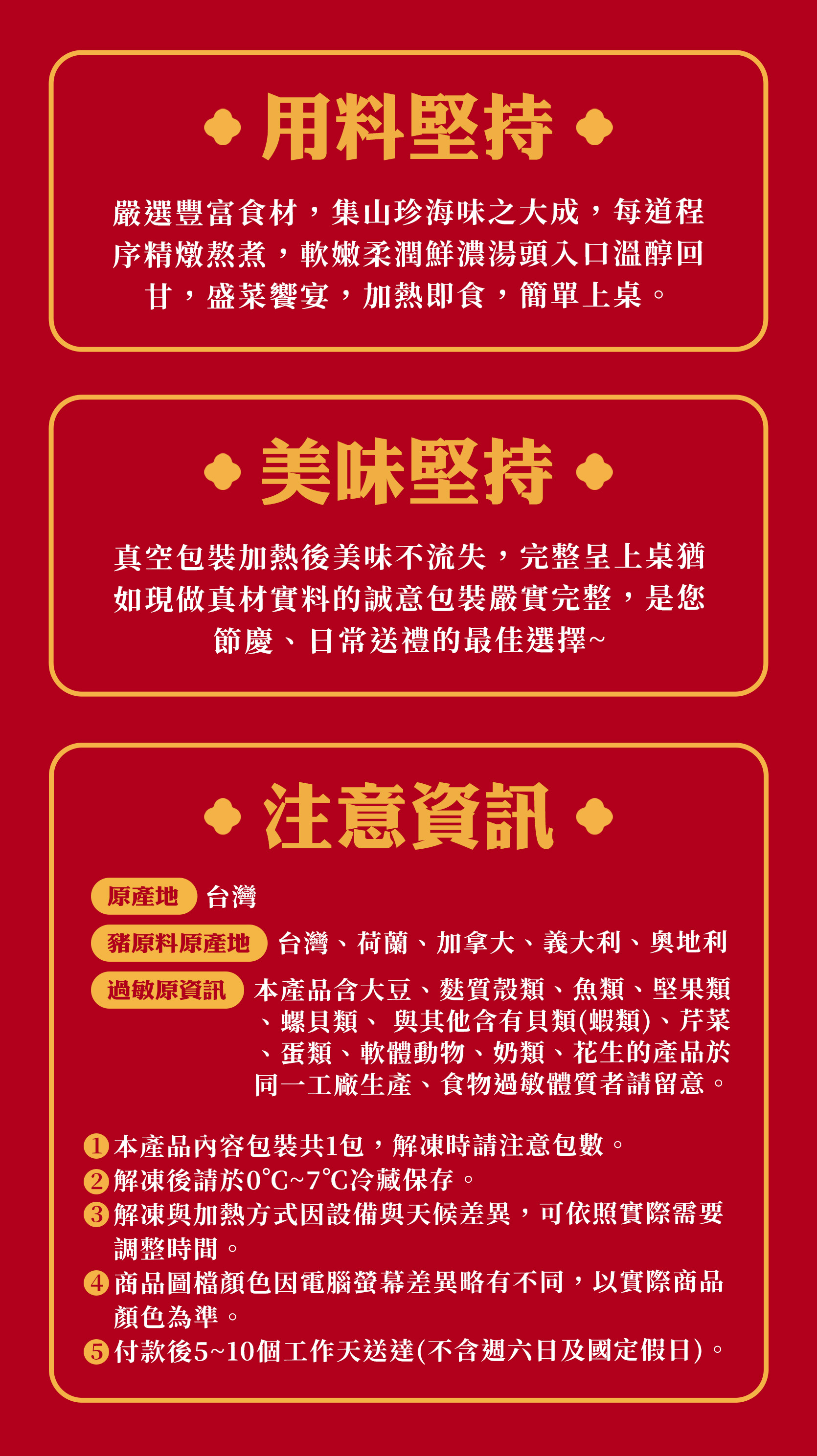 完成付款後3-7個工作天內送達(不含週六日及國定假日),若宅配公司遇上不可控制的交通因素可能會有提早或是延遲的狀況,若遇繁盛期(如農曆新年期間等)商品將可能延遲2~3日送達,不另行通知,期間商品將依冷凍全程完整保存,造成不便敬請見諒。