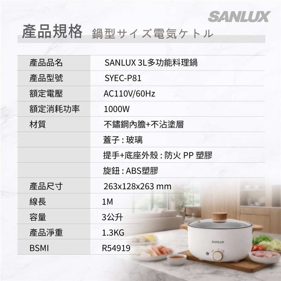 ★兩段火力調整,1000W大火力★3公升滿足大容量★不沾塗層設計,清洗方便★配置透明強化玻璃鍋蓋,安全有保障★蒸 / 煮 / 涮 / 炒多功能任選★拆卸式電源線輕鬆收納